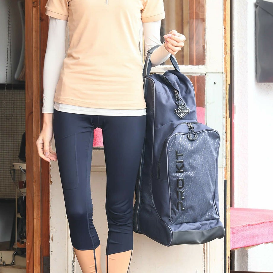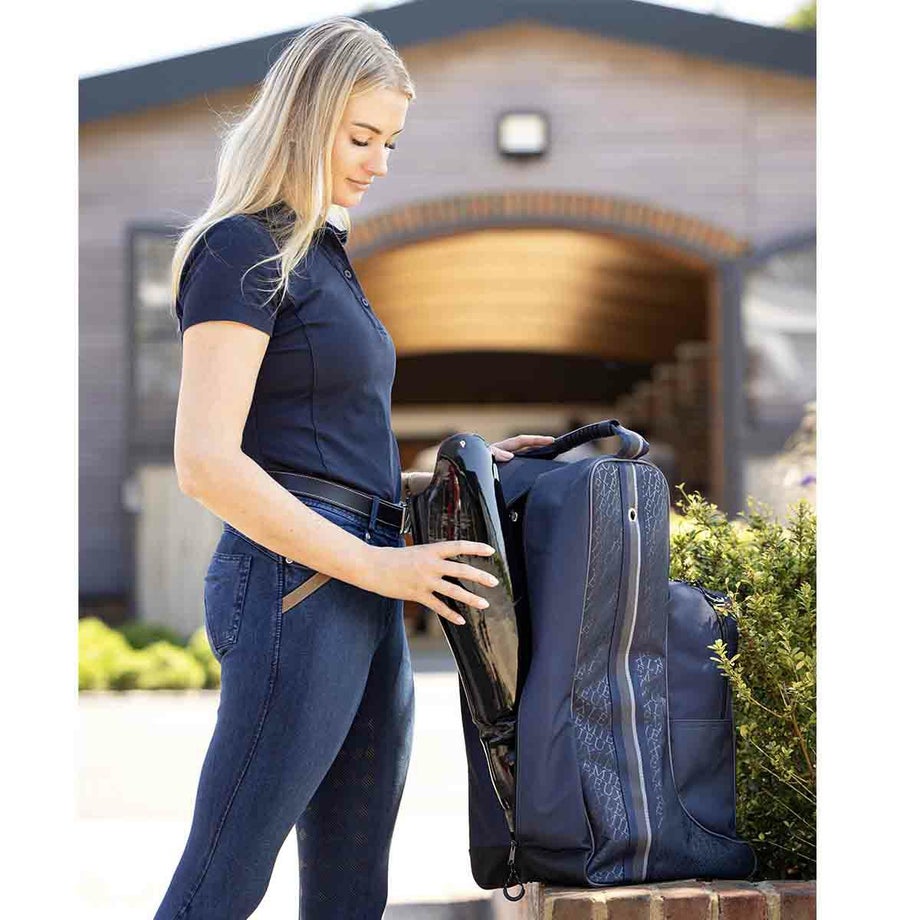 ・実用性とデザイン性を追求した乗馬用のブーツ&ヘルメットバッグ。・ジップで大きく開くのでムリなく収納できて、取り出しやすい。・防水性が高く、汚れがつきにくく、耐久性にすぐれた素材です。・ロゴパッチやシリコンプリントなどでさりげなくブランドをアピールする洗練されたデザイン。・ブーツバッグ部分にはパッド入りの仕切りがあり、片足ずつ収納ができます。