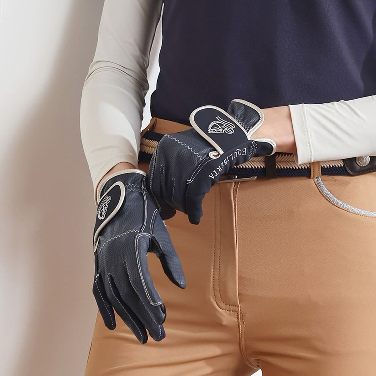 大人気のタイトフィット合皮グローブが改良されて再登場!男性と女性それぞれの手の形に合わせ、徹底的にフィット感にこだわり改良を重ねた日本人のためのグローブです。ユーザーの声を反映し、従来品に比べて手首やマジックテープが長くなりました。また新型マジックテープやスマホタッチを採用。より大きなXLサイズも追加されました。素材や肌触り、機能性にもこだわり抜いた逸品は、一度使うと手放せないアイテムです。・手綱をさばく手元は、上品かつエレガントに。騎乗中の手元は自分が思っているより目立つもの。グローブは、騎乗スタイルを印象付ける重要なアイテムです。高級感漂う光沢素材とEQULIBERTAのロゴマークの洗練されたデザインが、大人っぽく上品に仕上げてくれます。・驚くほどのフィット感日本人の男性と女性それぞれの手の形に合わせ、ミリ単位の調整をおこなって実現した驚きのフィット感。また従来品に比べてマジックテープが長くなり、フィット感の調整がしやすくなりました。・日焼け防止UVカット素材(UPF50+)なので、手を日焼けから守ります。また従来品に比べて手首の生地が長くなり、手首まできっちりと日焼けを防止します。・生地が絡みにくい新型のマジックテープを採用。テープ部分以外には貼り付かないので周りの生地や他の衣類を傷めません。・スマホタッチ対応親指・人差し指がスマホタッチ対応なので、手袋のままでスマートフォンを操作できます。(ホワイトのカラーのみスマホ未対応です)・素材へのこだわり手のひらや手の甲、指の間など、それぞれの役割に応じてこだわった様々な素材を組み合わせています。全ての素材に伸びやすい生地を使用しているので、ぴったりと手に馴染みます。・高級感のあるデザイン手の甲には、光沢があり高級感が漂う素材を使用。機能性だけではなく、見た目の美しさにもこだわりました。・滑りにくく握りやすい設計手のひらには、滑りにくい合皮ヌバックを使用。手綱を通す小指と親指も合皮ヌバックで補強してグリップをUPさせています。またぴったりフィットさせるサイズ感だから、生地がダブつかずしっかりと握れます。・通気性や肌触りの快適さを追求手の甲に、特殊なメッシュ状合皮を採用して通気性を確保。指の間は薄手で肌触りのよいニット生地を使用しているので、蒸れにくく快適です。・丸洗いOKでお手入れ簡単手のひらは汗をかきやすく、内も外も汚れやすいグローブ。丸洗いOKだから常に清潔を保て、お手入れも簡単です。