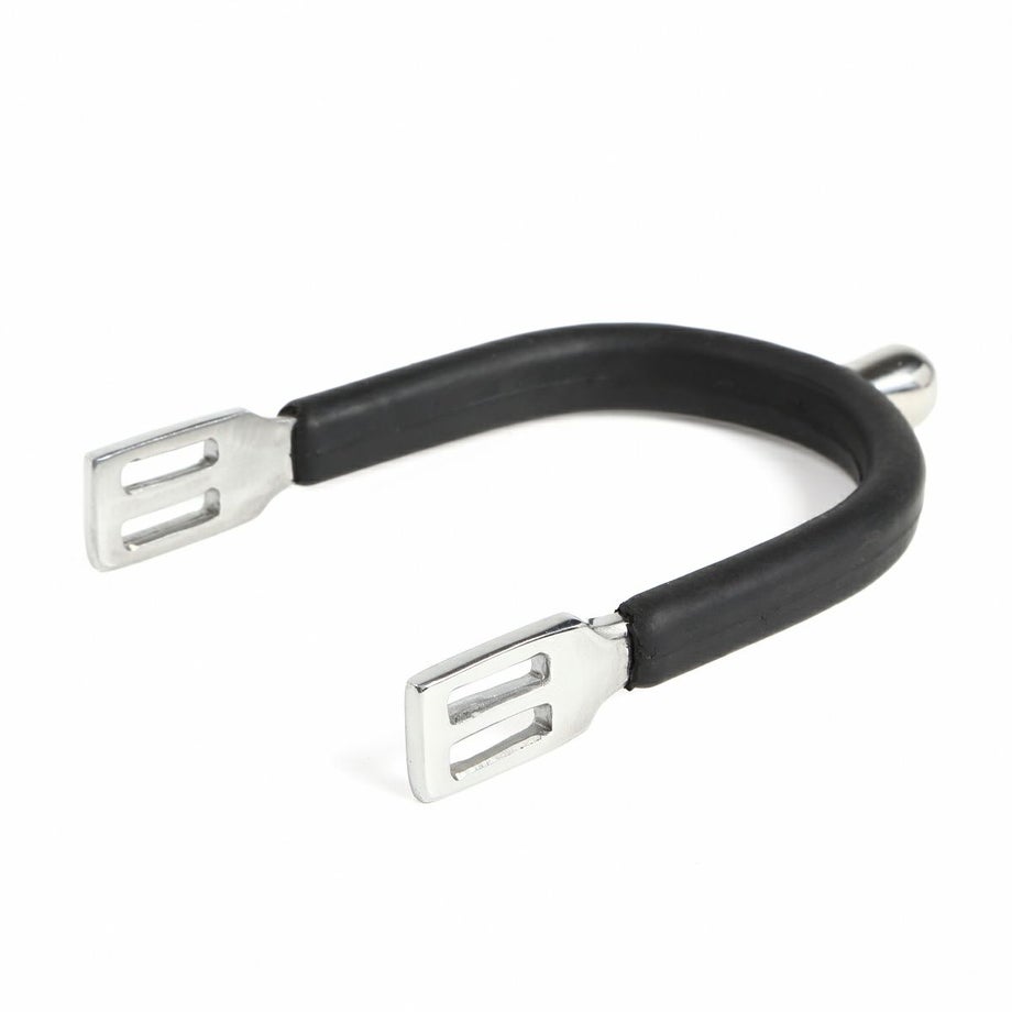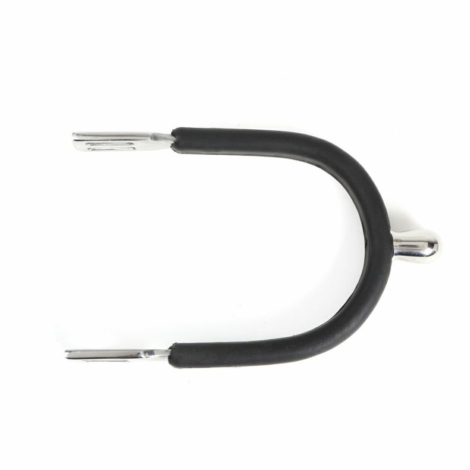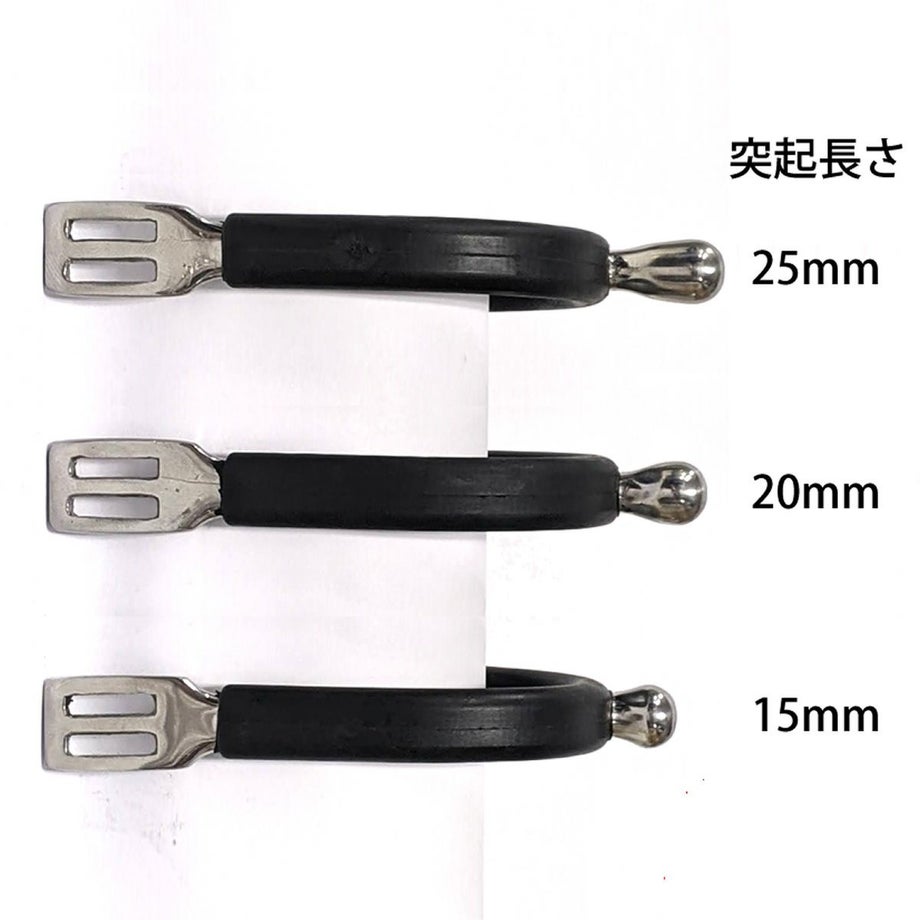 ・ブーツに当たる部分がゴムでカバーされた丸型突起のステンレス製拍車です。・ゴムがブーツを保護し、また滑り止めになるので拍車の位置も安定します。・大きな丸い突起なので当たりがとてもソフトで使いやすく、初心者から上級者まで幅広く人気のある定番拍車。・錆に強いステンレス製なので雨の日や洗い場でも気にせず使えます。・好みに応じて突起長さを選ぶことができます。※突起が長くなるほど馬への刺激が強くなります。初めてで分からない方は一般的によく使われる20mmがおすすめです。