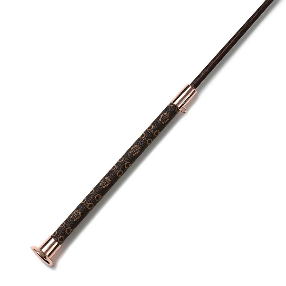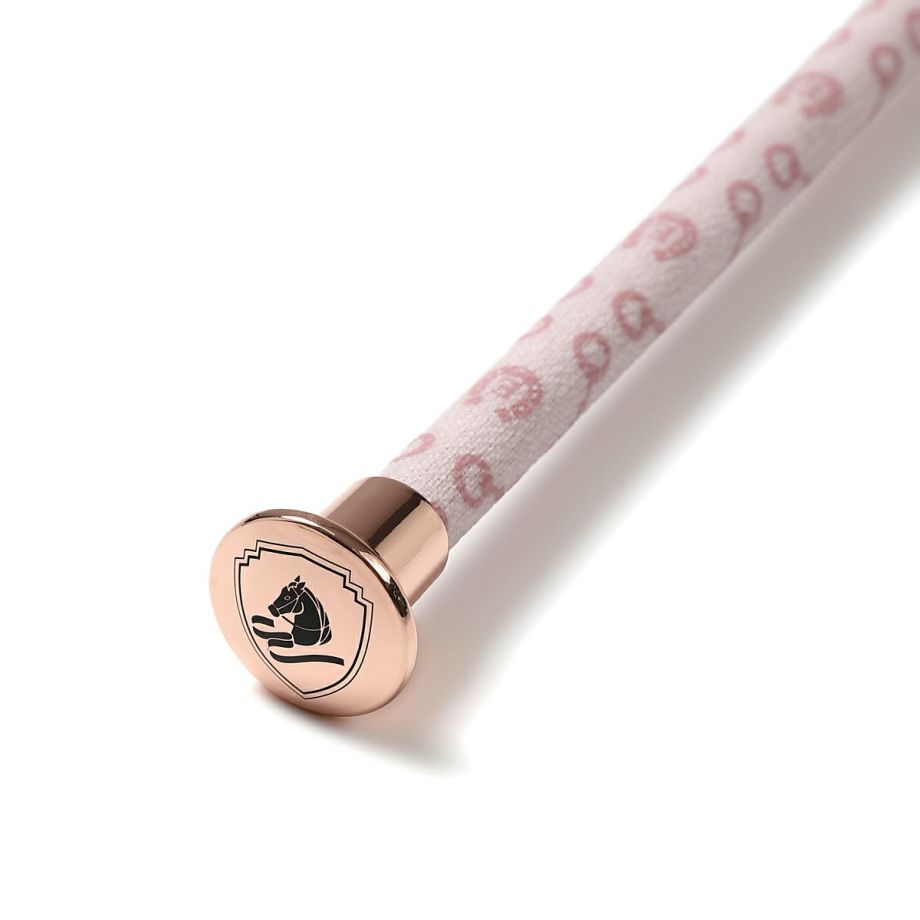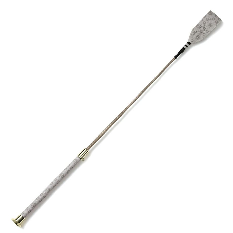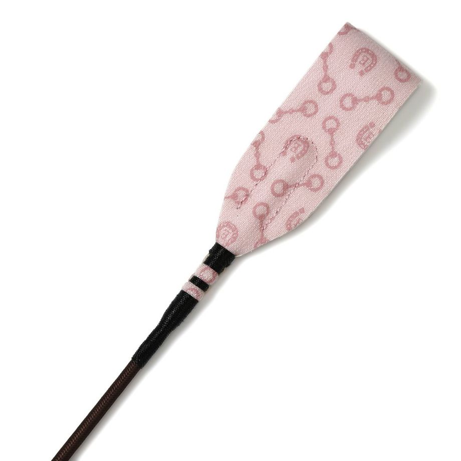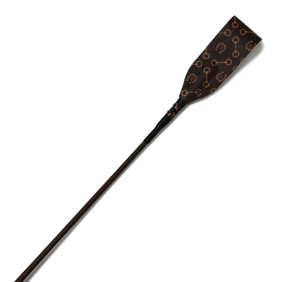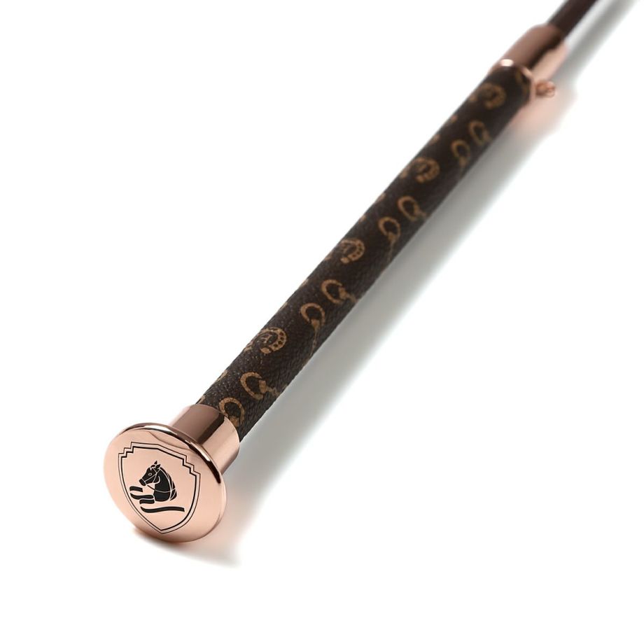 ハミと蹄鉄をあしらったモノグラム柄合皮が目を引く短鞭です。シボ加工を施した高級感のある合皮は丈夫で汚れにくい高機能素材。しなり具合はやや硬めとなります。あまり見かけないデザインだから、クラブでも注目されるかも!?高機能オリジナル生地合皮生地はPVCコートのキャンバス地に革のようなシボ加工を施した高級感のある素材。軽量かつ丈夫で、撥水性や防汚性も備えた高機能な素材です。生地メーカーの協力により実現した日本製オリジナル生地です。グリップにストラップホールがあるのでチャームやキーホルダーでオシャレできます。目印になって、よくあるムチの取り間違え防止にも。JODHPURS ムチ用リストバンドも取り付けしやすいです。