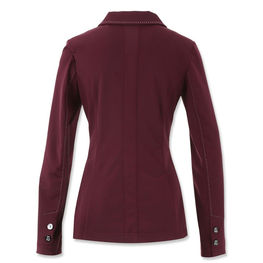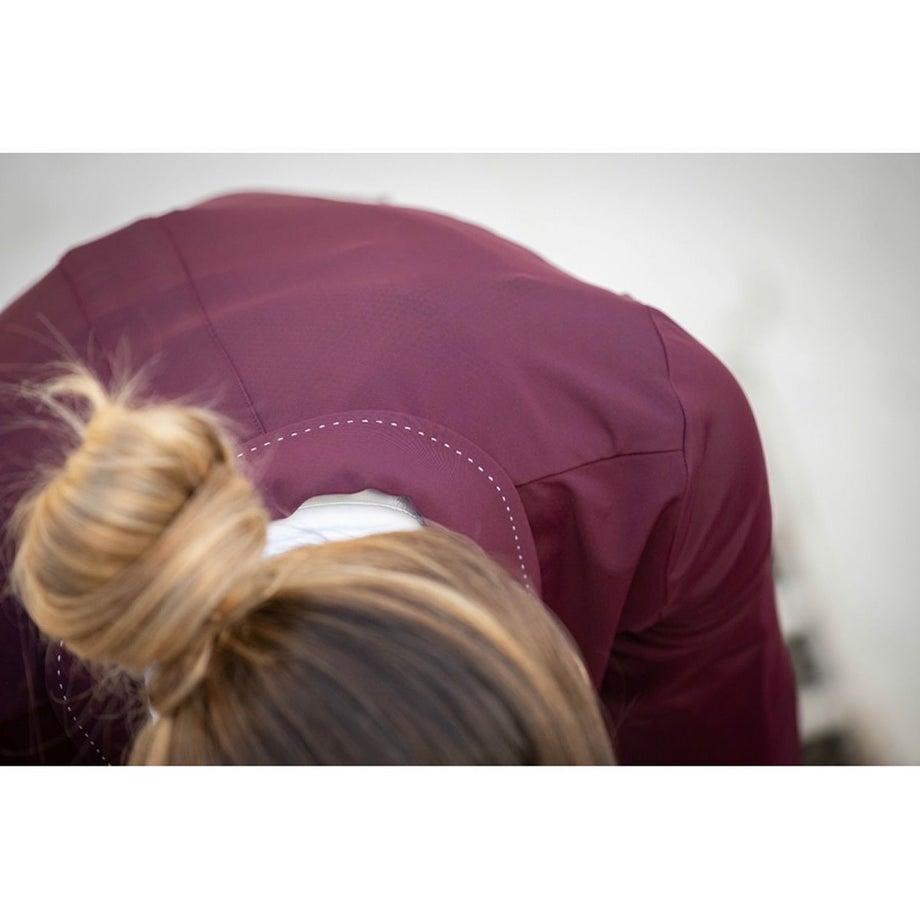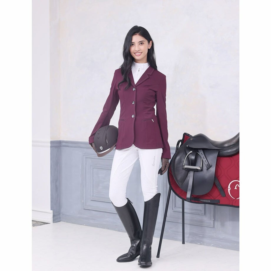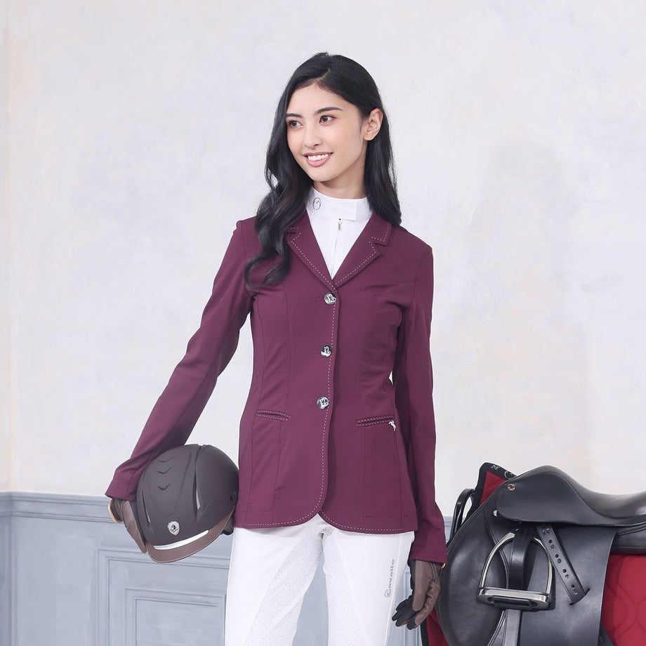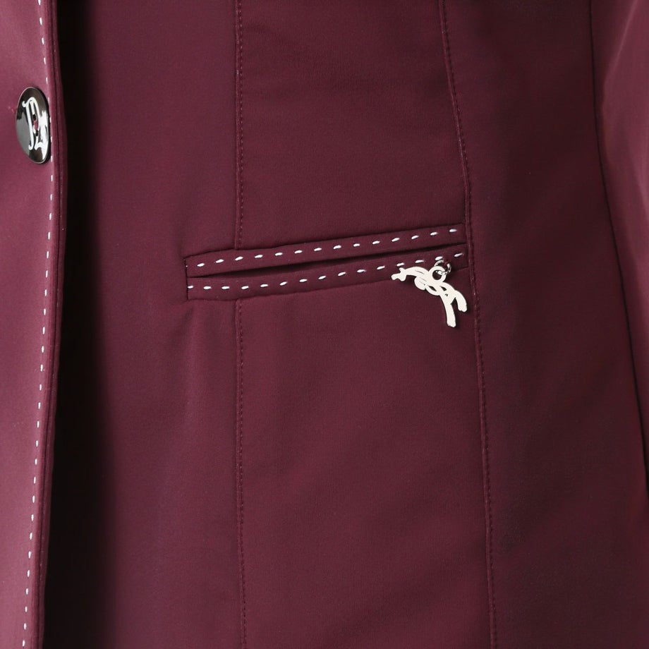 ・いまだかつてないほど軽くてストレッチが効いたテクニカル素材のショージャケット。・上品な発色のプラムがフェミニンな魅力を引きたてます。・ホワイトのステッチを襟や裾、ポケットまわりなどにあしらい、強度と美しさをアップします。・ロゴ刻印入りの美しいシェルのフロントボタン、左のフェイクポケットにあしらったロゴプレートが気品を添えています。・通気性や伸縮性、タフさを兼ね揃えた快適なジャケット。・スタイルをキレイに見せるウエストシェイプのデザイン。・動きやすさをサポートするサイドベンツタイプ。・フェイクポケット:フロント2ヶ所。・ロゴ入りの不織布ジャケットカバー付き。