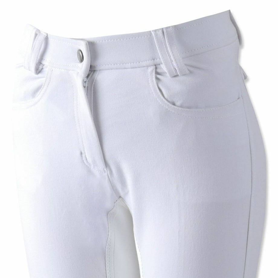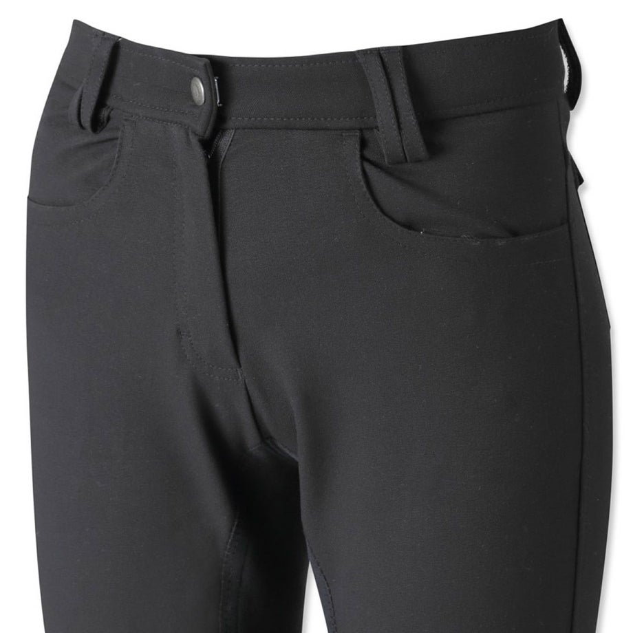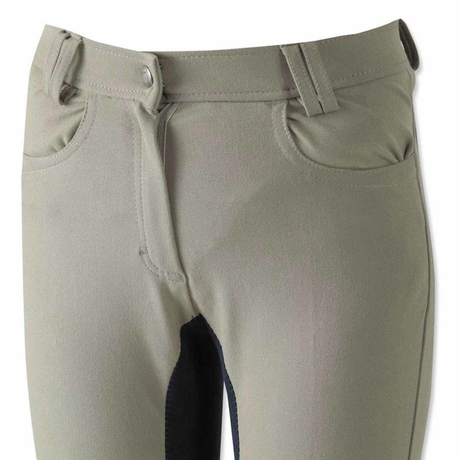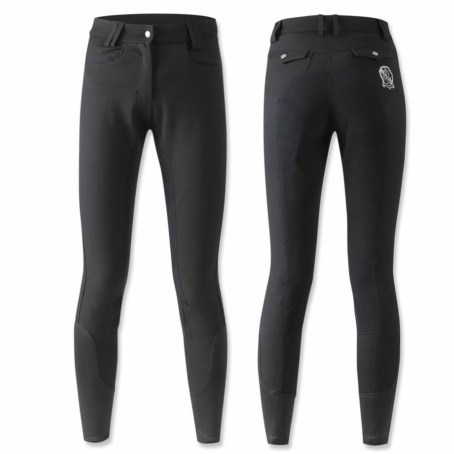 シンプルにまとまった落ち着いたデザインの尻革キュロットは流行や年齢に左右されず使いやすいデザイン。長年改良を続けたキュロットだから、履き心地も騎乗のしやすさも抜群のアイテムです。・昔ながらの尻革タイプ滑り止め効果のある合皮スエードがヒップから内股まで張られた、昔ながらの尻革キュロット。最近は使い勝手の良い新型のシリコングリップタイプが主流になってきていますが、従来の尻革タイプを選ばれる方もまだまだいらっしゃいます。丈夫で生地の厚い独特の感触や、まさしく「乗馬パンツ」という見た目がお好みの方におすすめのアイテムです。・素材へのこだわり生地やボタン、ファスナーなど全ての素材にこだわりました。ボタンは騎乗に適したものをドイツから取り寄せ。生地は専門機関で百貨店並みの厳しい試験に合格したものです。ファッショントレンドに合わせて独自のカラーで染め上げた生地は、日本人好みのニュアンスカラーに仕上がっています。・日本人の騎乗に最適化されたシルエット熟練デザイナーとパタンナーが、生地の特性を考慮して型紙からデザインしたキュロットは、姿勢の美しさと動きやすさを両立しました。ウエストのフロントが浅くバックが深いデザインは、騎乗時の座り込んだ姿勢でウエストをきっちりカバー。股部分を工夫してまたがりやすく、ひざ部分にゆとりをもたせ曲げやすくし、騎乗のしやすさを追及したシルエットに仕上がっています。・高い縫製技術を活かしたフィット感生産はヨーロッパ向けキュロットを手がけるメーカーが協力。長年培われた技術が活かされた縫製は耐久性とフィット感が抜群です。・足首周りはストレッチ素材で快適足首周りにストレッチ素材を採用。ふくらはぎまでストレッチ素材を伸ばすことで抜群のフィット感と快適な履き心地を実現しました。※フロントボタンはレディースサイズは右前、ジュニアサイズは左前となります。