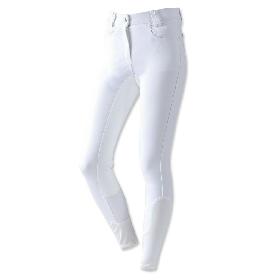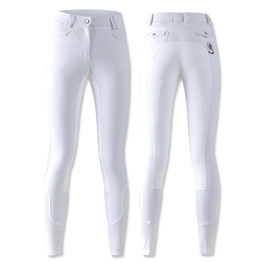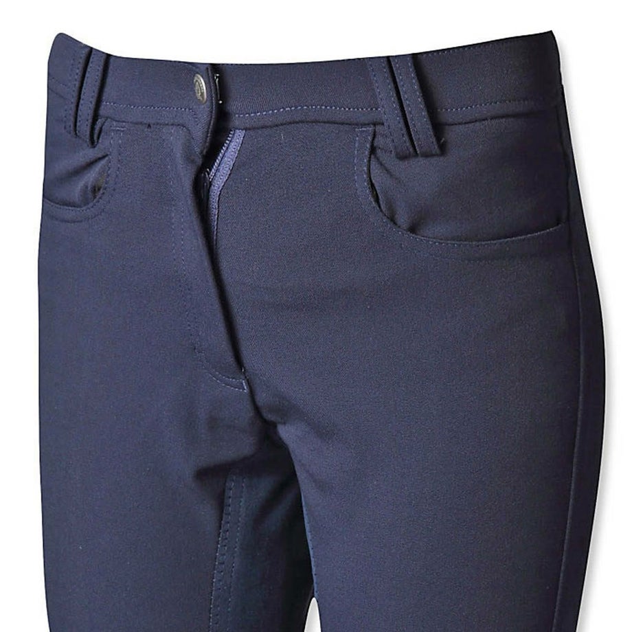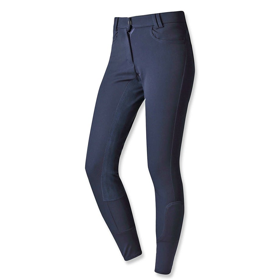 シンプルにまとまった落ち着いたデザインの尻革キュロットは流行や年齢に左右されず使いやすいデザイン。長年改良を続けたキュロットだから、履き心地も騎乗のしやすさも抜群のアイテムです。・昔ながらの尻革タイプ滑り止め効果のある合皮スエードがヒップから内股まで張られた、昔ながらの尻革キュロット。最近は使い勝手の良い新型のシリコングリップタイプが主流になってきていますが、従来の尻革タイプを選ばれる方もまだまだいらっしゃいます。丈夫で生地の厚い独特の感触や、まさしく「乗馬パンツ」という見た目がお好みの方におすすめのアイテムです。・素材へのこだわり生地やボタン、ファスナーなど全ての素材にこだわりました。ボタンは騎乗に適したものをドイツから取り寄せ。生地は専門機関で百貨店並みの厳しい試験に合格したものです。ファッショントレンドに合わせて独自のカラーで染め上げた生地は、日本人好みのニュアンスカラーに仕上がっています。・日本人の騎乗に最適化されたシルエット熟練デザイナーとパタンナーが、生地の特性を考慮して型紙からデザインしたキュロットは、姿勢の美しさと動きやすさを両立しました。ウエストのフロントが浅くバックが深いデザインは、騎乗時の座り込んだ姿勢でウエストをきっちりカバー。股部分を工夫してまたがりやすく、ひざ部分にゆとりをもたせ曲げやすくし、騎乗のしやすさを追及したシルエットに仕上がっています。・高い縫製技術を活かしたフィット感生産はヨーロッパ向けキュロットを手がけるメーカーが協力。長年培われた技術が活かされた縫製は耐久性とフィット感が抜群です。・足首周りはストレッチ素材で快適足首周りにストレッチ素材を採用。ふくらはぎまでストレッチ素材を伸ばすことで抜群のフィット感と快適な履き心地を実現しました。※フロントボタンはレディースサイズは右前、ジュニアサイズは左前となります。