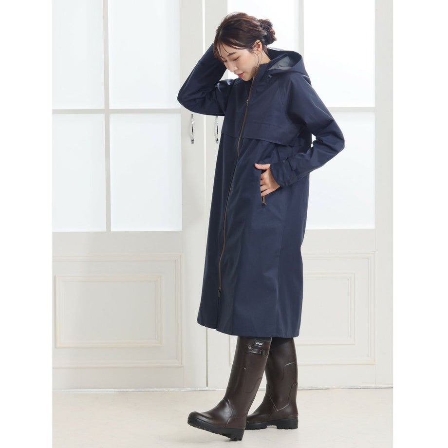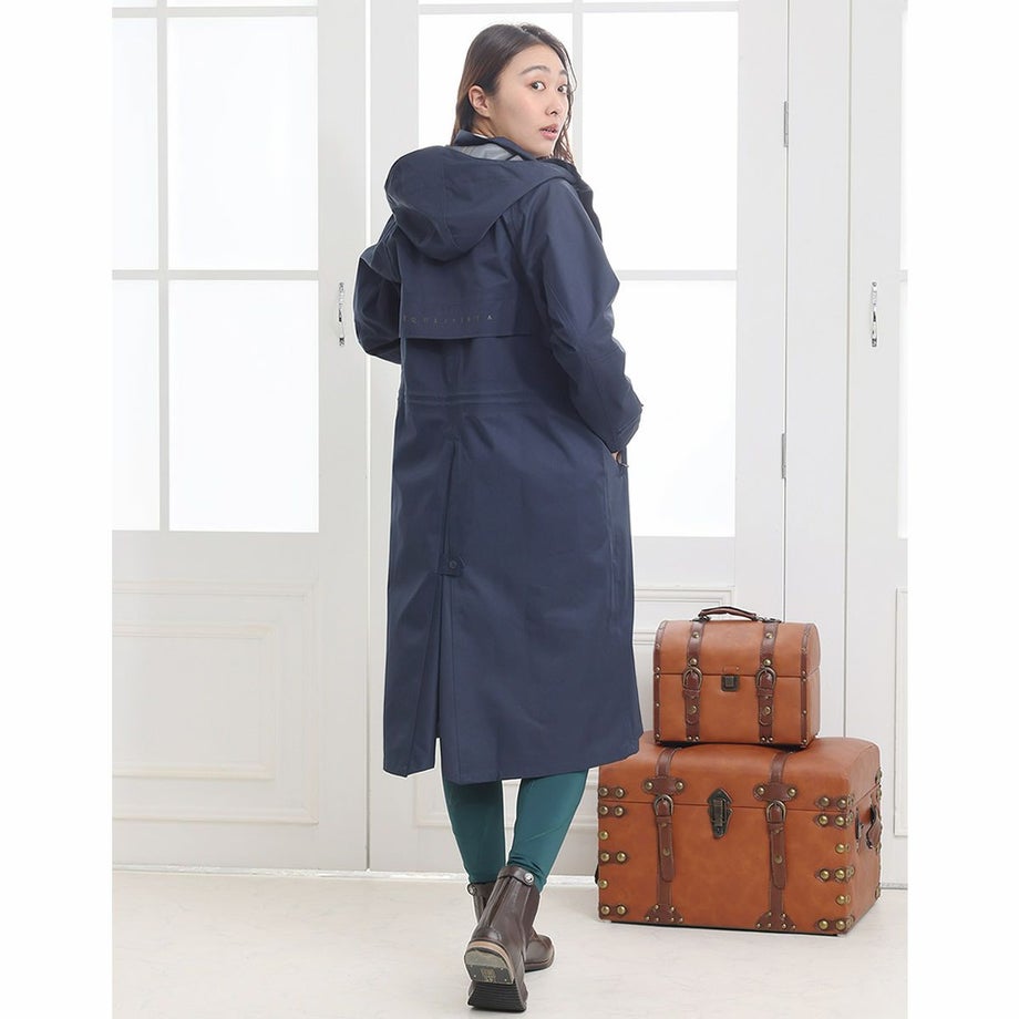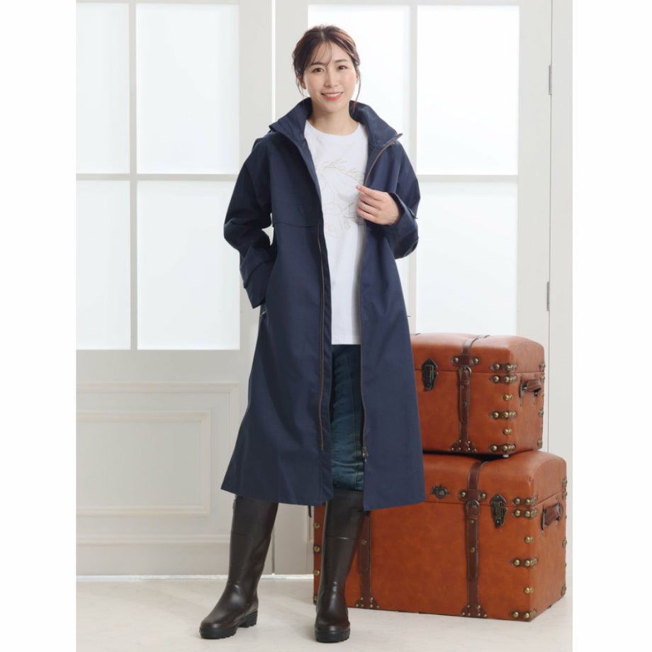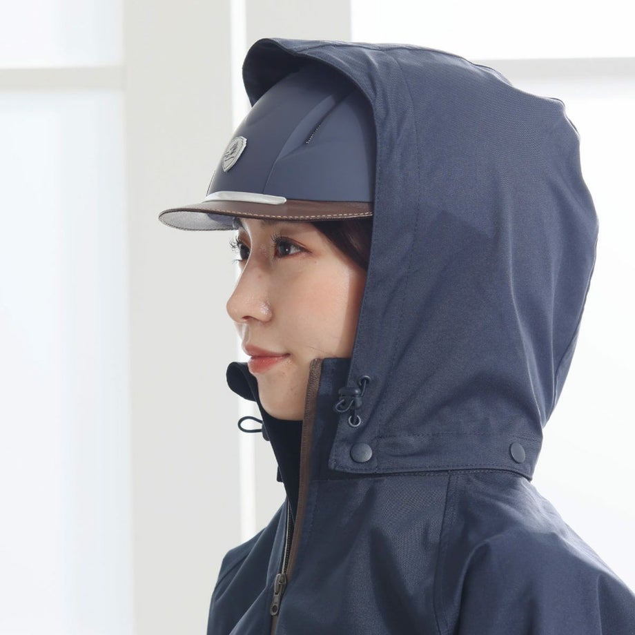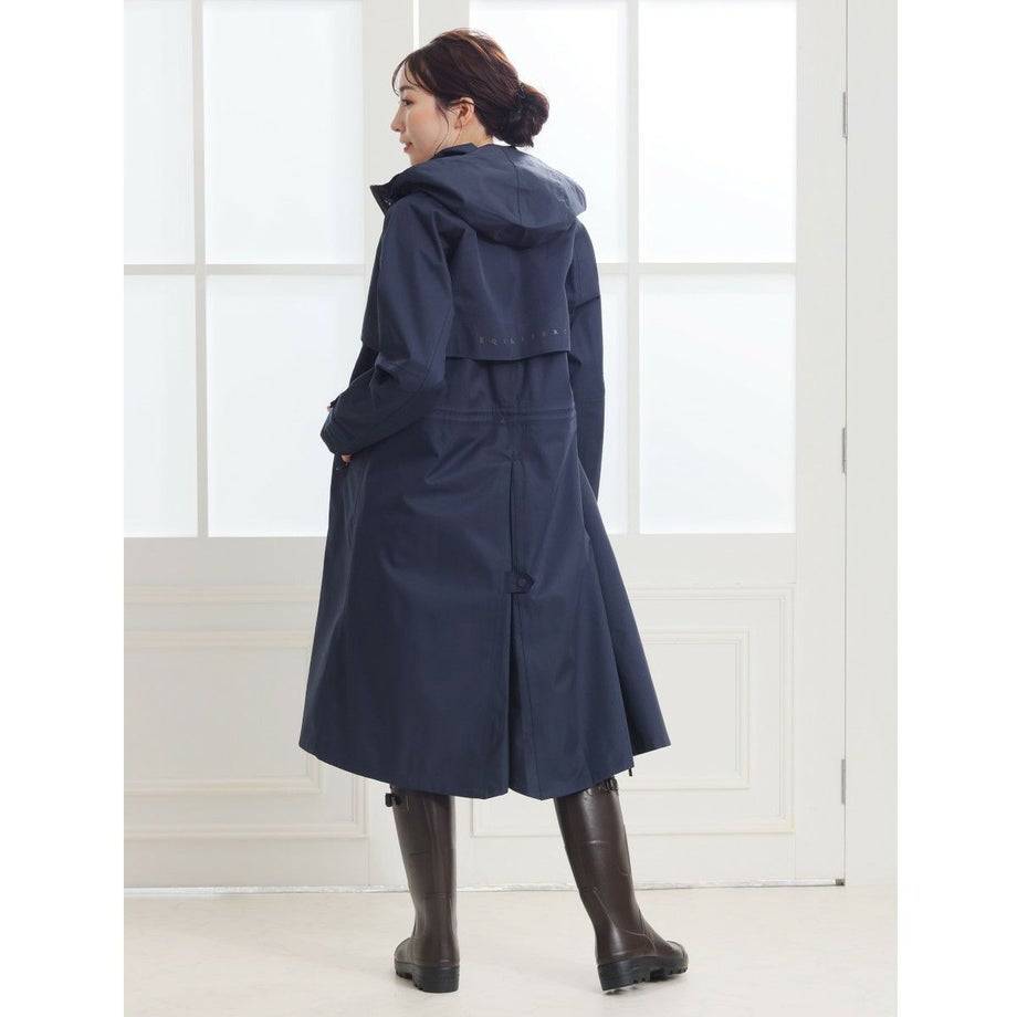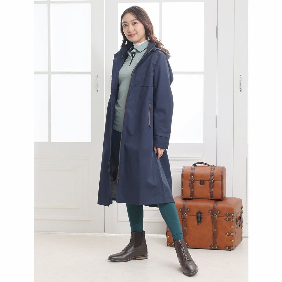 機能面でもデザイン面でも妥協することなく、悪天候でもアクティブな乗馬が楽しめるように設計された乗馬用の高機能レインコート。耐水性や透湿性、防風性にすぐれた高品質の【ドライシェルファブリック】を採用。日本人のための洗練された乗馬スタイルを追求するブランドならではの、細部にまでこだわりつくした逸品。ハイスペックなレインコートは乗馬のみならず、あらゆるアウトドアシーンで頼りになる存在です。■高機能素材【ドライシェルファブリック】・激しい雨風の日にも安心できる、防水・防風・防汚、撥水性のすぐれた高品質の丈夫な生地で、ムレを軽減しドライに保つ透湿性もそなえています。・耐水圧10,000㎜、透湿性 8,000g/m2・24h。■デザイナーがこだわった上品なスタイル・質感のよい落ち着いたネイビーの生地。・さりげないアクセントになるジップや背中のロゴにはシックなブラウンをセレクト。・フィット感や動きやすさを意識しつつ、ラインの美しさにもこだわっています。■より動きやすく、より快適に・肘部分にはダーツをとって、ツッパリ感を軽減。・手綱を持ったときにもできるだけ雨に濡れないようにカーブした袖口を採用。・袖口やウエストの絞りを微調整して、フィットさせることができます。・ウエストのスピンドルコードは内側に備え、スッキリと邪魔にならない設計です。・大きく開くバックスリットは内側にも生地がついているので、外に出して雨から鞍をカバーすることができます。・フロントは開閉を調節できる便利なダブルジップ。・騎乗時に裾の広がりをおさえる足用ループがついています。 (ご自身の身長に合わせて、上下どちらかのループをご使用ください)・フードはボタンで取り外しが可能です。・雨水が侵入しにくいジップ付きのポケット:フロント2ヶ所。・速乾性と肌ざわりを向上するメッシュの裏地。・パネルの通気孔で熱気を逃がすベンチレーション仕様。・襟元にあるループは、雨などで濡れた後にレインコートをサッとかけるのに便利です。■乗馬以外のシーンでも・動きやすく見栄えのする高機能レインコートは乗馬以外の様々なシーンでも活躍します。・キャンプやフェスなどのアウトドアはもちろん、バイクや自転車でのお出かけ、雨の日の通勤などにもオススメです。