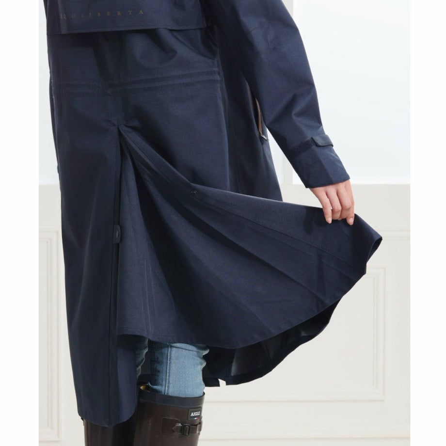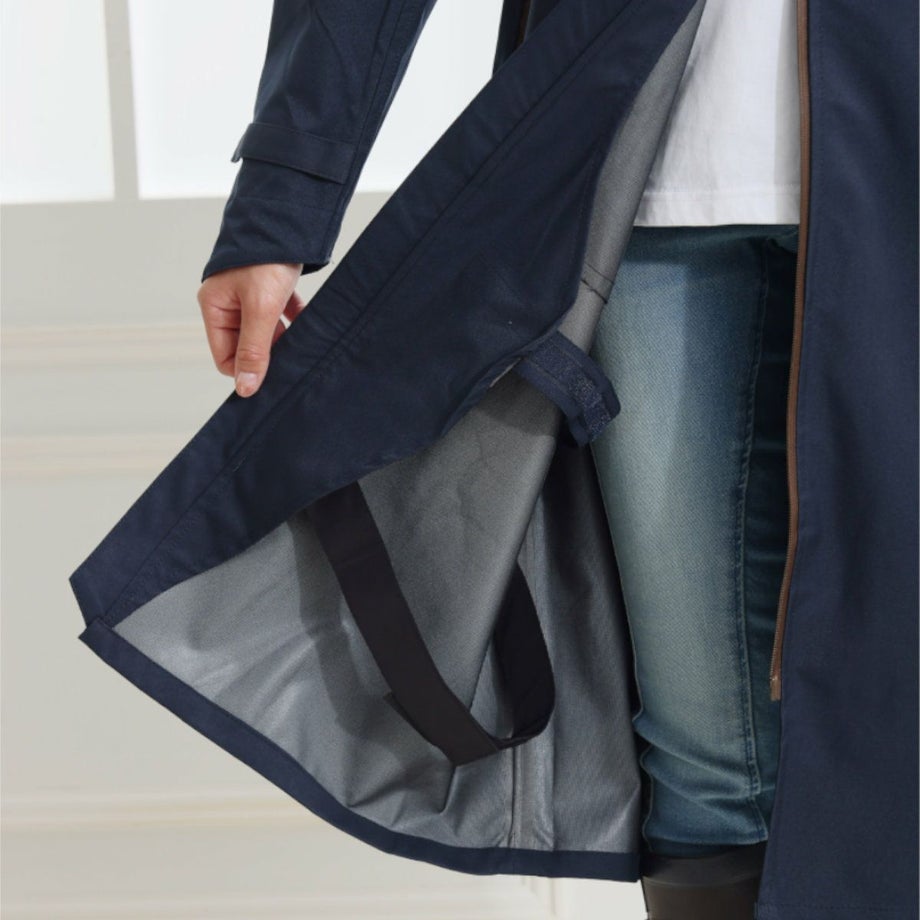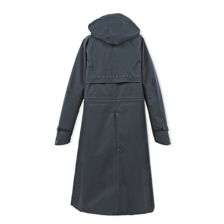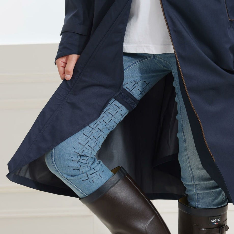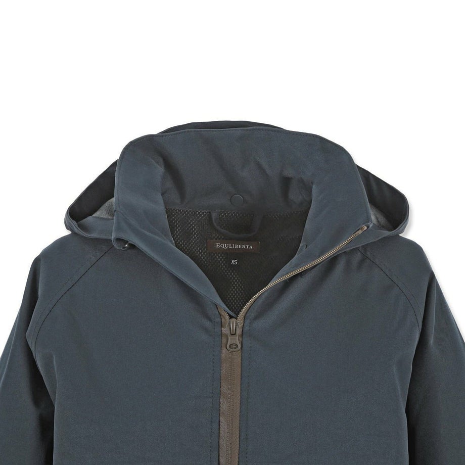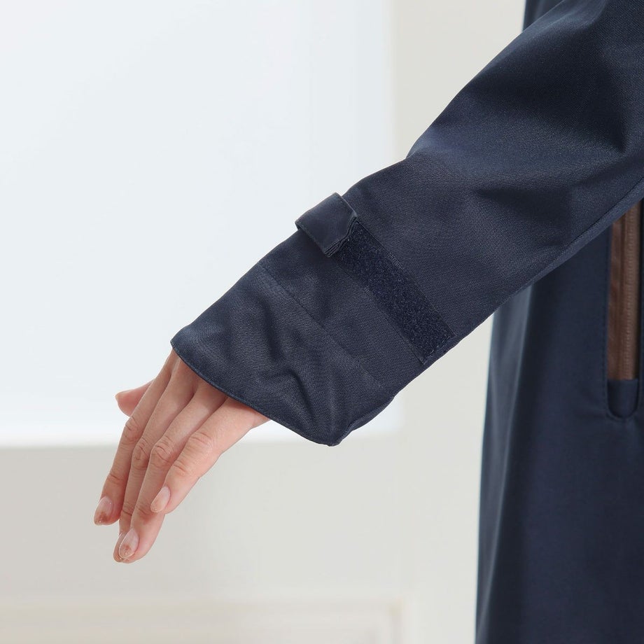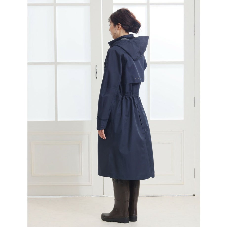 機能面でもデザイン面でも妥協することなく、悪天候でもアクティブな乗馬が楽しめるように設計された乗馬用の高機能レインコート。耐水性や透湿性、防風性にすぐれた高品質の【ドライシェルファブリック】を採用。日本人のための洗練された乗馬スタイルを追求するブランドならではの、細部にまでこだわりつくした逸品。ハイスペックなレインコートは乗馬のみならず、あらゆるアウトドアシーンで頼りになる存在です。■高機能素材【ドライシェルファブリック】・激しい雨風の日にも安心できる、防水・防風・防汚、撥水性のすぐれた高品質の丈夫な生地で、ムレを軽減しドライに保つ透湿性もそなえています。・耐水圧10,000㎜、透湿性 8,000g/m2・24h。■デザイナーがこだわった上品なスタイル・質感のよい落ち着いたネイビーの生地。・さりげないアクセントになるジップや背中のロゴにはシックなブラウンをセレクト。・フィット感や動きやすさを意識しつつ、ラインの美しさにもこだわっています。■より動きやすく、より快適に・肘部分にはダーツをとって、ツッパリ感を軽減。・手綱を持ったときにもできるだけ雨に濡れないようにカーブした袖口を採用。・袖口やウエストの絞りを微調整して、フィットさせることができます。・ウエストのスピンドルコードは内側に備え、スッキリと邪魔にならない設計です。・大きく開くバックスリットは内側にも生地がついているので、外に出して雨から鞍をカバーすることができます。・フロントは開閉を調節できる便利なダブルジップ。・騎乗時に裾の広がりをおさえる足用ループがついています。 (ご自身の身長に合わせて、上下どちらかのループをご使用ください)・フードはボタンで取り外しが可能です。・雨水が侵入しにくいジップ付きのポケット:フロント2ヶ所。・速乾性と肌ざわりを向上するメッシュの裏地。・パネルの通気孔で熱気を逃がすベンチレーション仕様。・襟元にあるループは、雨などで濡れた後にレインコートをサッとかけるのに便利です。■乗馬以外のシーンでも・動きやすく見栄えのする高機能レインコートは乗馬以外の様々なシーンでも活躍します。・キャンプやフェスなどのアウトドアはもちろん、バイクや自転車でのお出かけ、雨の日の通勤などにもオススメです。