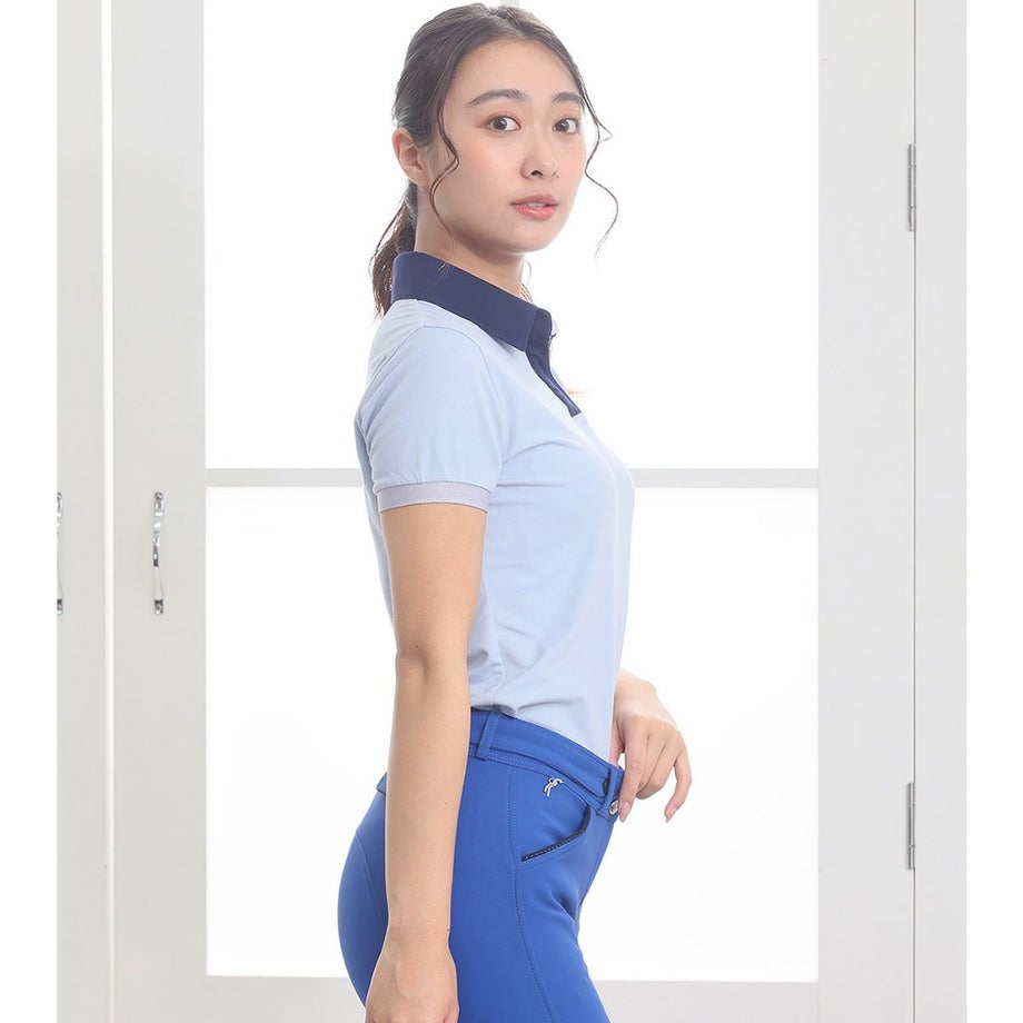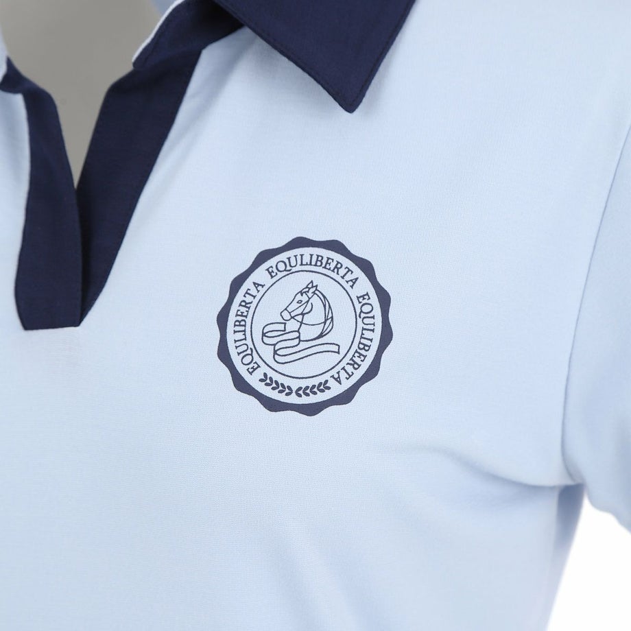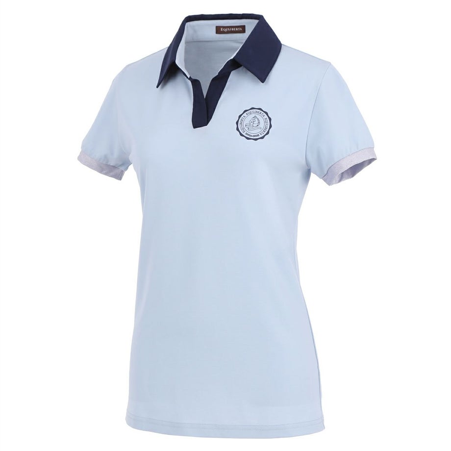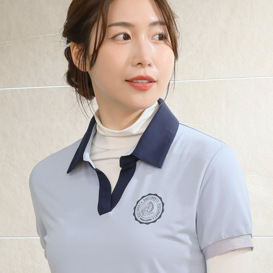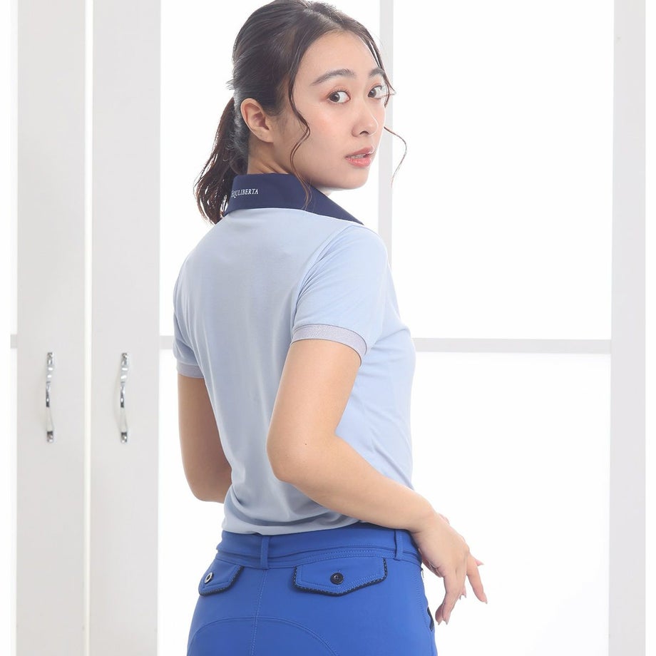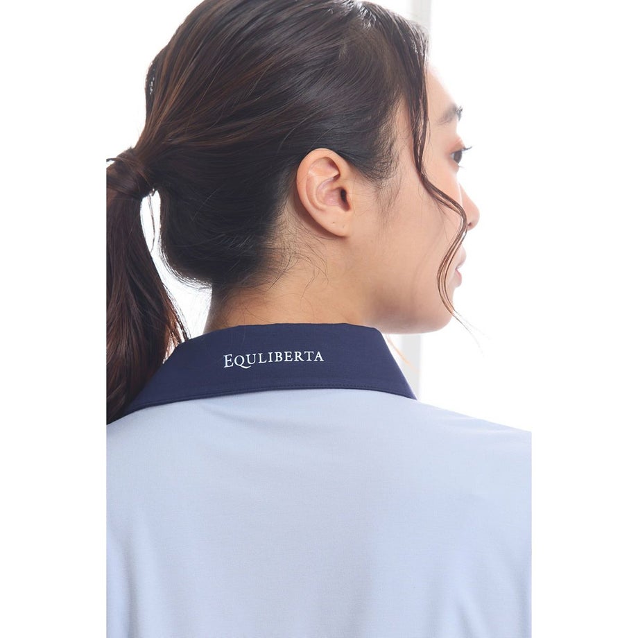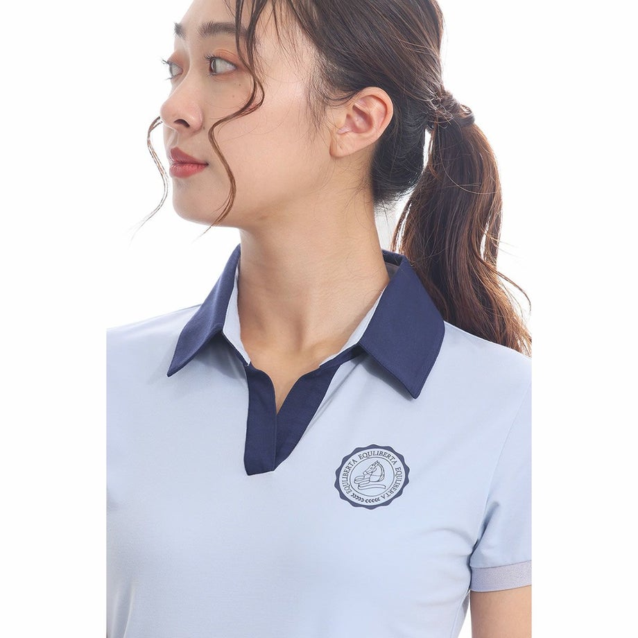 ・ボタンレスのスキッパーネックのポロシャツ。・V開きのデザインは、首元をすっきりとキレイに見せてくれます。・身頃には、これからの季節にうれしいUVカットのひんやりとした素材をセレクトしました。・さわやかなサックスに、首周りは相性の良いネイビーを合わせることでキリっとした印象に。・袖口にはさりげないラメ生地を使用、スポーティな中にも華やかな雰囲気を漂わせます。・胸元とバックのロゴがさりげないアクセント。・柔らかな伸縮性のある素材が、ボディラインをすっきりと見せてくれます。・着心地がよくてスタイリッシュなスキッパーシャツは乗馬はもちろん、様々なスポーツやアウトドアシーンで活躍します。