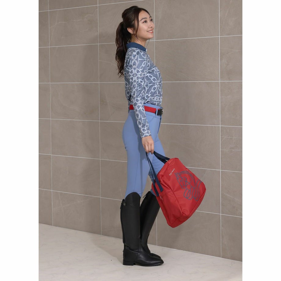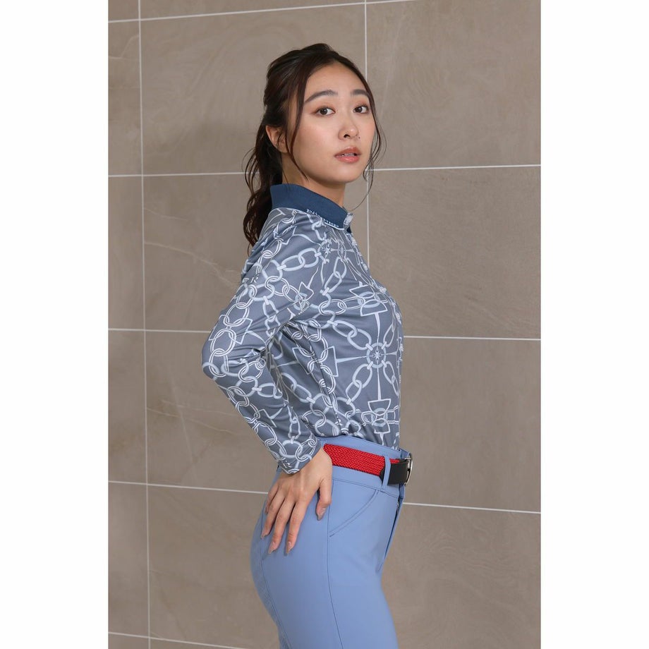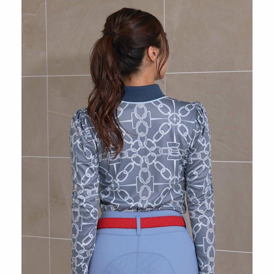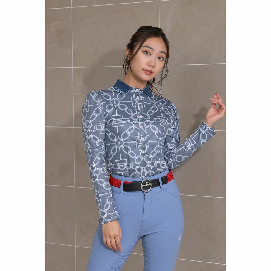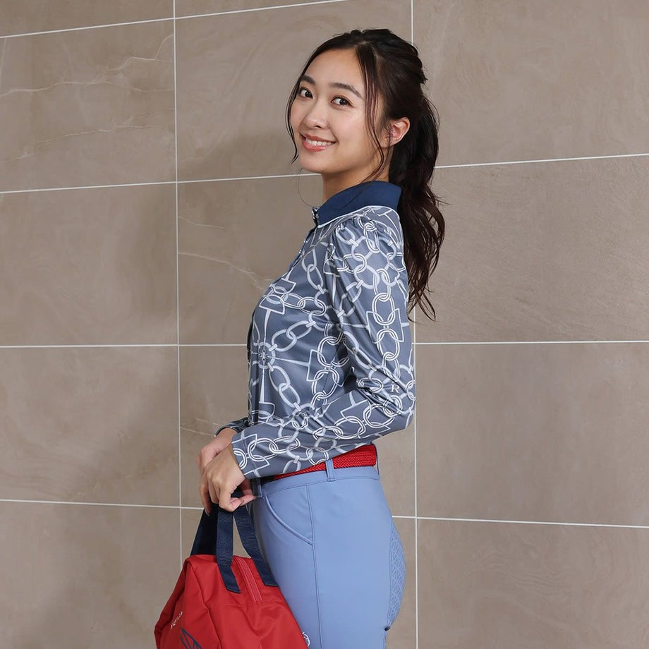 ・軽量でソフトなピケプリント生地を使用、エレガントでありながら動きやすさにも配慮。・UVカット機能で紫外線から肌を保護。・色落ちしにくく美しい色合いを長く保持。・刺繍のディテールが入ったニットの襟が、さりげないおしゃれを演出。・個性的な手描き風プリントは他にはない、ユニークなデザイン。・スマートで女性的なシルエットが、ライディング姿を美しく演出。・乗馬だけでなく、カジュアルな装いにもマッチ。