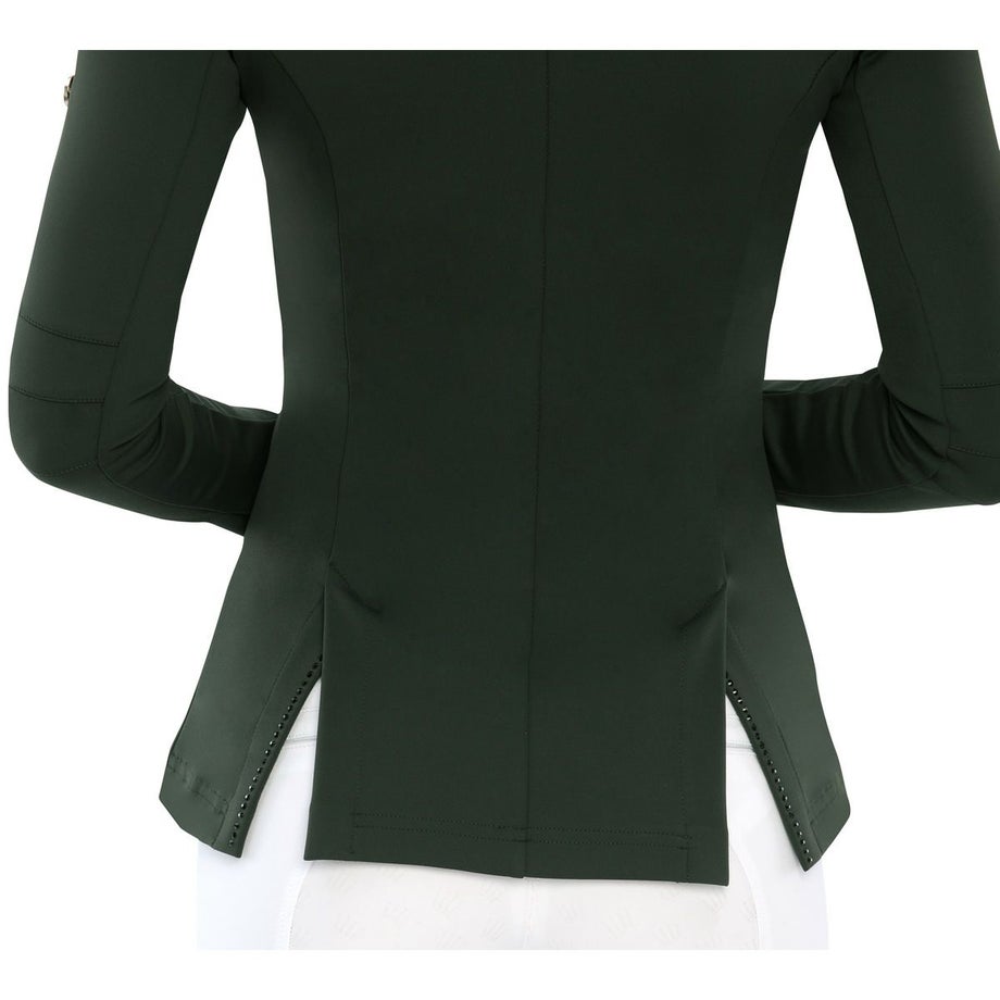 ・輝きが美しいスワロフスキーをふんだんにあしらった乗馬用のショージャケット。・パフォーマンスを上げる伸縮性に優れた高品質のストレッチ素材を使用。・エレガントでキレイめなデザインですが軽くて疲れにくい設計がポイント。・襟、フェイクポケット、ちらりと見えるサイドベンツの内側にスワロフスキーがあしらわれています。・高級感のあるクラウンのロゴプレートが左腕のアクセント。・ウエストシェイプなのでスタイルをより美しく見せてくれます。・フロントはボタン開閉。・ジップ式の換気口を両脇下に備えます。・ポケットなし。・競技会ではもちろん、オフィスでも活用したくなるアイテムです。