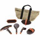 ・基本的な馬のお手入れ道具6点とグルーミングバッグがお得なセットになりました。・高級感のあるレザー調のグルーミングシリーズ。・撥水キャンバス地製の3WAYグルーミングバッグは洗い場でのお手入れや持ち運び、収納に便利です。【セット内容】・グルーミングバッグ撥水キャンバス地製のEQULIBERTAオリジナル3WAYグルーミングバッグ。持ち手が3種類あり、洗い場のお手入れにも便利なバーストラップが付いています。・てっぴブラシ付きだから裏掘りとひづめのお手入れが両方できる。ソフトなレザーで包んだ持ち手は握りやすくて作業効率をUP。落ち着いたカラーバリエーションで高級感があるブラシ付きてっぴ。・ゴムブラシ馬への当たりもソフトなゴム製でほどよい硬さ。ブラシとして馬の毛を落としたり、馬体のマッサージにもオススメ。扱いやすく、高級感があるデザインも〇・ダンディブラシほどよいサイズ感で扱いやすい馬体ブラシ。やや大きめですが軽量で持ちやすく設計され、馬体のお手入れをスムーズに。高級感があるレザー調のデザインも目を引きます。・仕上げブラシツヤやかに美しく。丸洗いを終えた馬体の毛並みに輝きを与えるワンステップにオススメ。とびきりソフトな極細ナイロン毛の仕上げブラシ。フェイスブラシとしても使えます。・汗こき馬の丸洗いに欠かせない。水切りに最適な「汗こき」に新しいラインナップが登場。ソフトなレザーを巻きつけた持ち手はすべりにくく握りやすくて高級感もUP。馬体にやさしいラバー製です。・たてがみ&しっぽブラシ馬のたてがみやしっぽのお手入れにはこちら。ブラシの先が丸くて馬へのあたりがソフトなたてがみ&しっぽブラシ。すべりにくくて、握りやすい設計の持ち手はレザー調で高級感があります。