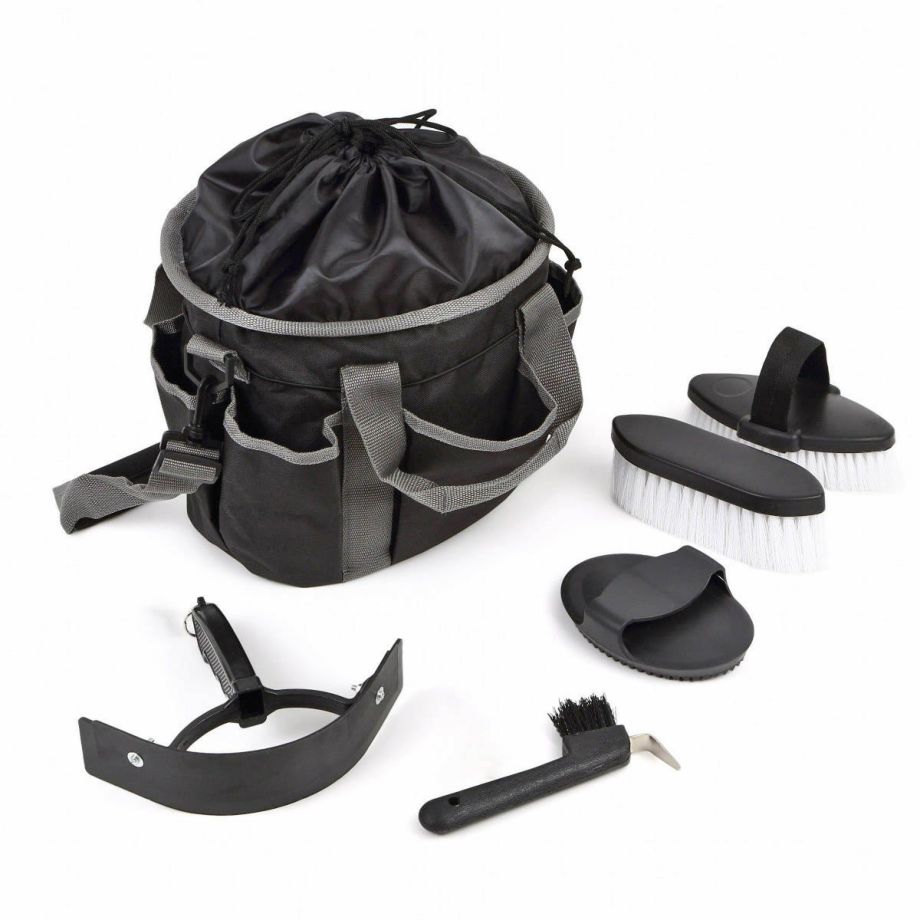 ・当店オリジナル商品・基本的な馬のお手入れ道具が揃った5点セット。・グルーミングバッグ付きで、持ち運びや収納に便利です。・お値段重視の方におすすめ。工場からの直接仕入れで、品質はそのままにこのお値段を実現しました。【セット内容】・グルーミングバッグバラバラになりがちなお手入れ道具をひとまとめに!コンパクトながら外に6個ポケットがあり、巾着式カバーは高さもあるのでたくさん収納できます。お手入れ道具から脚元プロテクターやグローブまでひとまとめに出来ます。外ポケット上部についているゴムが落下を防止します。ショルダー付きで荷物が多いときにも持ち運びラクラク。・てっぴブラシ付きなので、ひづめの泥落としなどにお手入れがはかどります。・ゴムブラシ適度な硬さのゴムで出来たブラシ。金属ではないので馬体を傷付けません。使いやすい手のひらサイズです。適度な硬さなのでマッサージ効果も。フケも抜け毛もしっかりキャッチするので皮膚病予防にも。・ハード馬体ブラシ (ダンディブラシ・根ブラシ)しっかり硬めの馬体用ブラシです。ブラシ部分が少し固めなので、馬体やたてがみ・しっぽについた泥やおが等の汚れをしっかり落とせます。硬めの冬毛でもしっかりブラッシング出来ます。・ソフト馬体ブラシ (仕上げブラシ)仕上げブラシとしてはやや硬めの毛質です。丸洗い後に使用すると、毛に輝きが増します。・汗こき持ち手部分が握りやすく滑りにくい形状の汗こき。本体がプラスチックで水切り部分はラバー製です。金属製に比べ軽くて使いやすく、馬体も傷つけません。