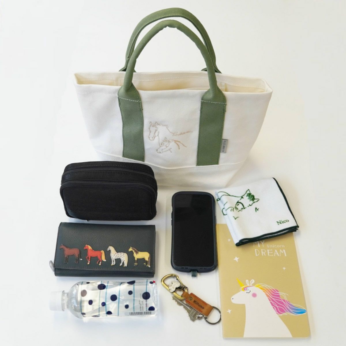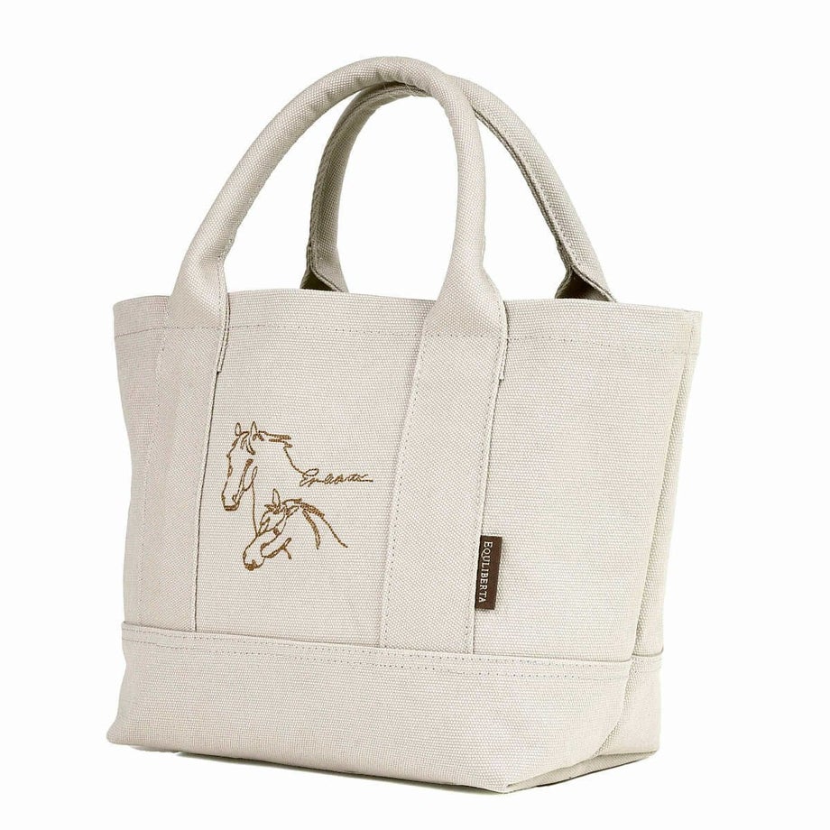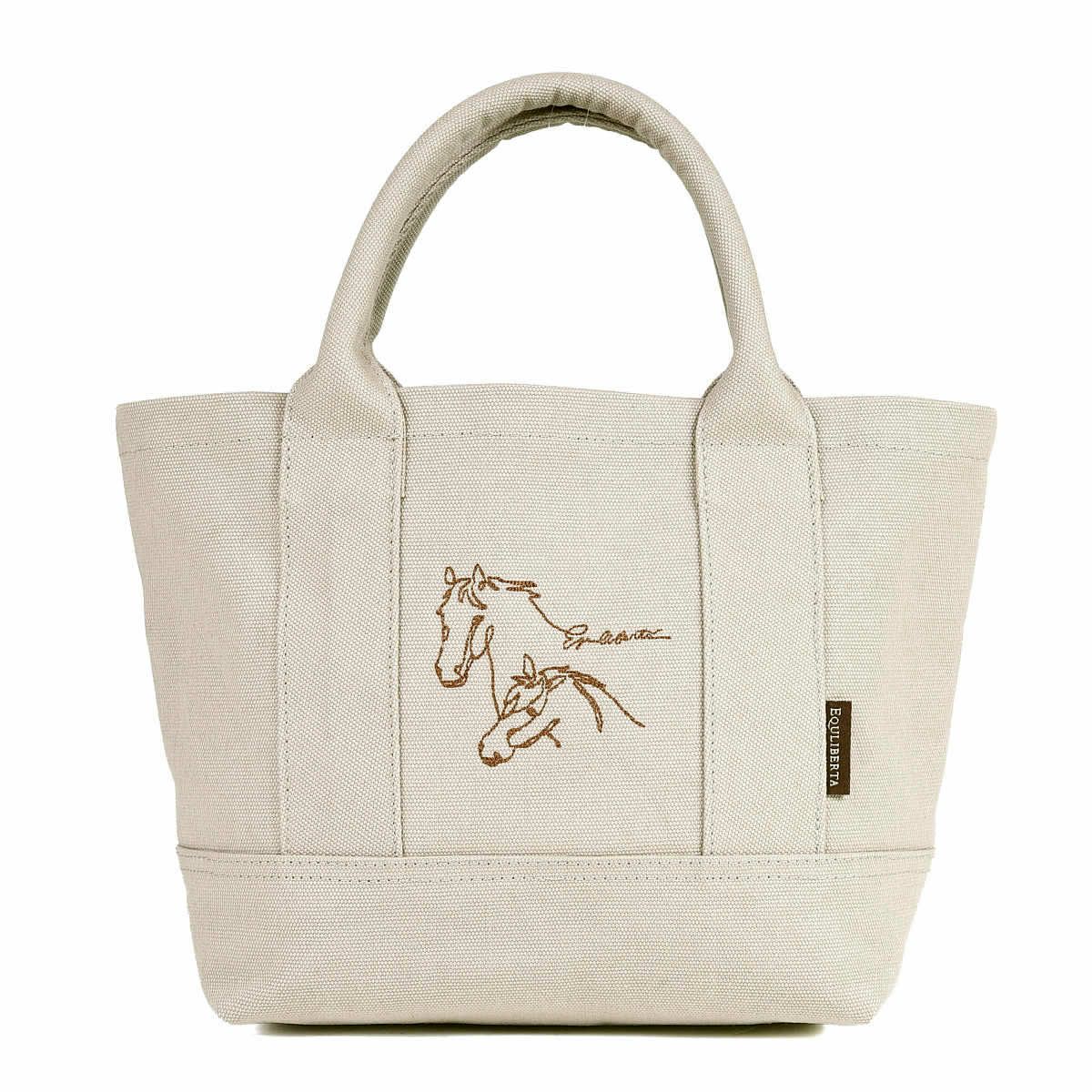 ・ホース刺繍に心惹かれるミニキャンバストートバッグ。・繊細な糸を使った刺繍で施した2頭の寄り添う馬とレターロゴがポイント。・マチが大きく、見た目の印象より収納力があります。・表地に丈夫で耐久性のあるキャンバス生地を、裏地にはポリエステル素材をセレクト。・ペットボトルやランチボックスなども入れやすく、出し入れもスムーズです。・馬愛をさりげなくアピールできるステキなデザイン。・普段使いのちょっとしたお出かけなど、シーンを選ばず大活躍してくれます。・財布、スマートフォン、鍵、ハンカチ、ティッシュなど、必要最低限のものを入れて、近所への買い物やカフェに行く際に。・お弁当を入れて、職場へのランチバッグとして。・ペットボトルや折り畳み傘を入れて、散歩や軽い運動をする際に。・普段使いの大きめのバッグとは別に、貴重品だけを入れて持ち歩きたい時に。・旅行先で、観光する際に必要なものだけを入れて身軽に行動したい時に。・書類や資料などを分けて持ち運びたい時に。・コーディネートのアクセントとして、持つだけでおしゃれ度がアップします。・プレゼントを入れて、ギフトバッグとしても。