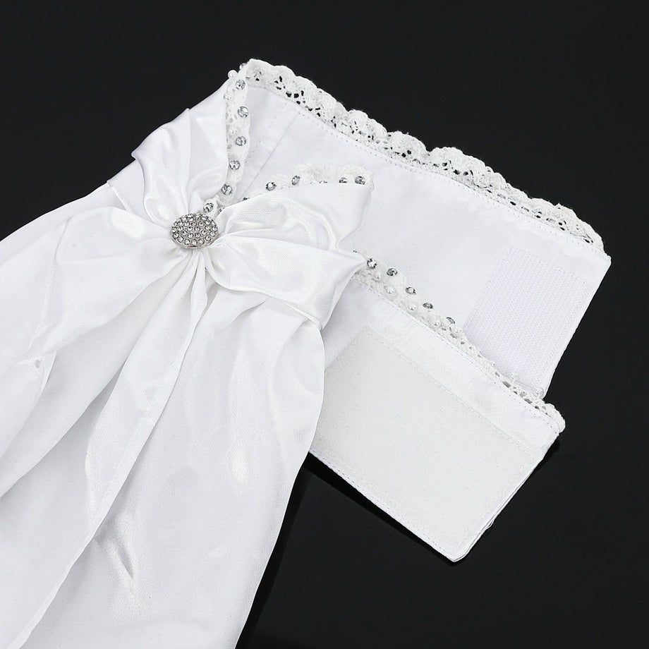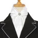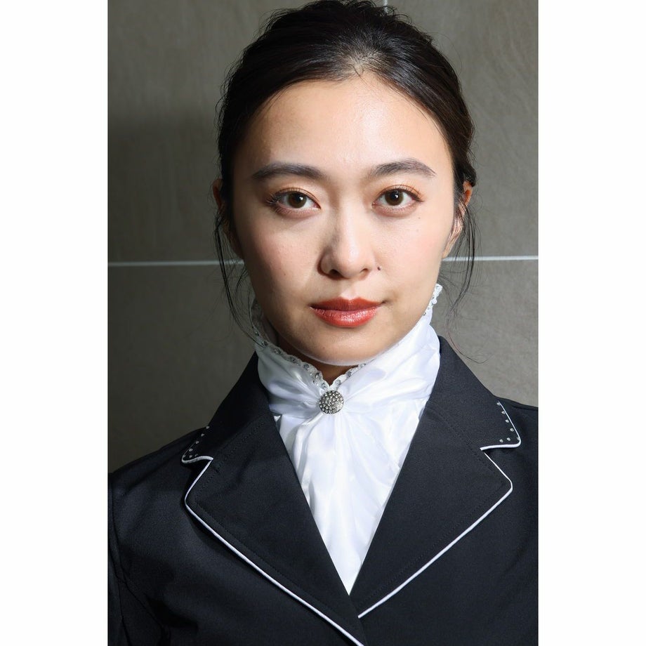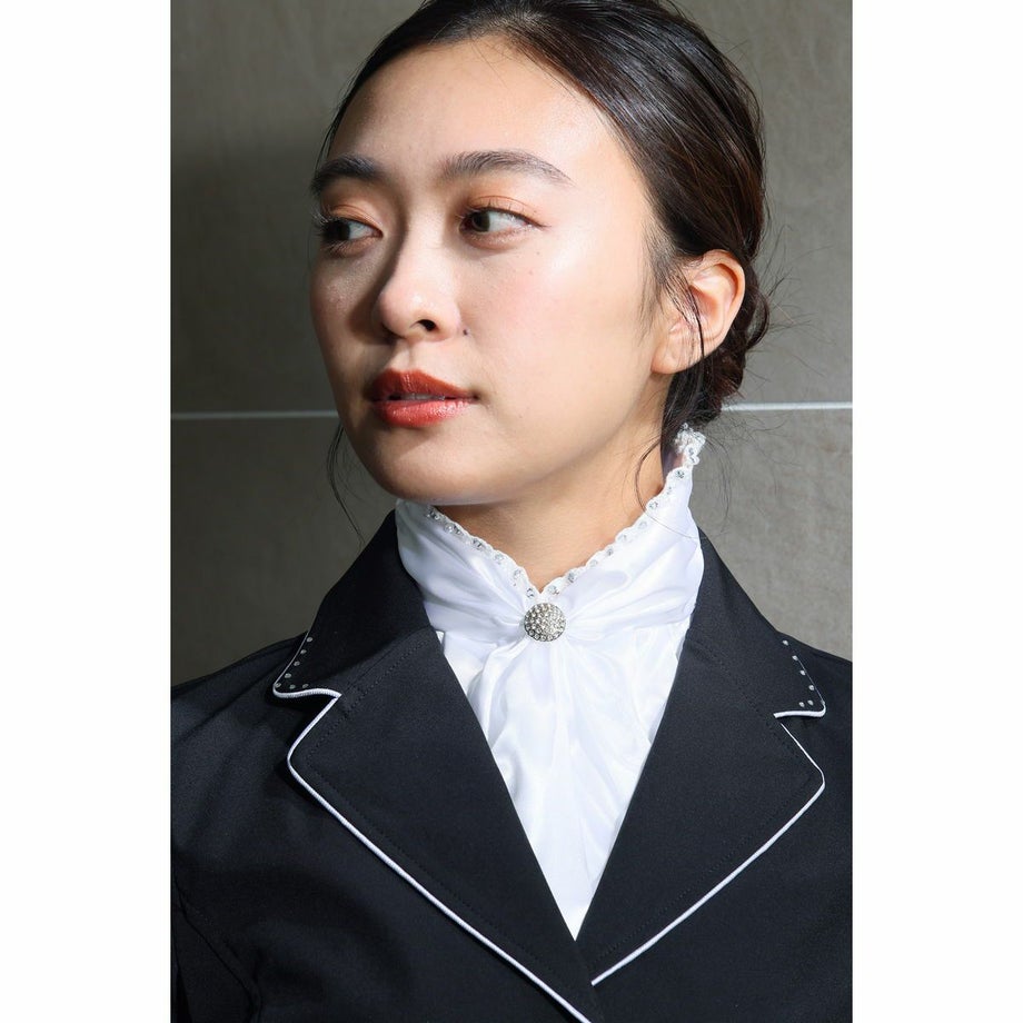 ・デザイナーこだわりの「品の良いゴージャス」デザイナーの「ゴージャスだけど品が良い」というコメントを体現したデザイン。派手すぎず、競技会にふさわしい上質で洗練された華やかさを胸元に添えます。・華やかなビジューレース襟周りには、ストーンと白いビーズがあしらわれたビジューレースを贅沢に配置。顔周りを明るく、エレガントに彩ります。・上品な光沢サテン素材素材はポリエステル100%でありながら、美しい光沢を放つサテンの風合いで、ドレッシーな雰囲気を醸し出します。・存在感のある中央ストーン中央の結び目には、大粒で存在感のあるストーンを配置。遠目からも輝き、鞍上での印象を強く残します。・ワンタッチで簡単装着忙しい競技会場でも手間取りません。襟裏にベルクロ(面ファスナー)を採用しており、ボタンやピンを使わずにワンタッチで簡単に装着・着脱が可能です。・首元がすらりと見える工夫アスコットタイの帯の面積を広くしたデザインを採用し、アスコットタイを巻くことで首元をすらりと見せることができます。・競技会に最適正装が求められる競技会やドレッサージュ(馬場馬術)の装いを、洗練されたエレガンスで格上げします。・ご家庭での洗濯も可能手洗いが出来る生地を採用しているので、日頃からのお手入れも簡単に済みます。