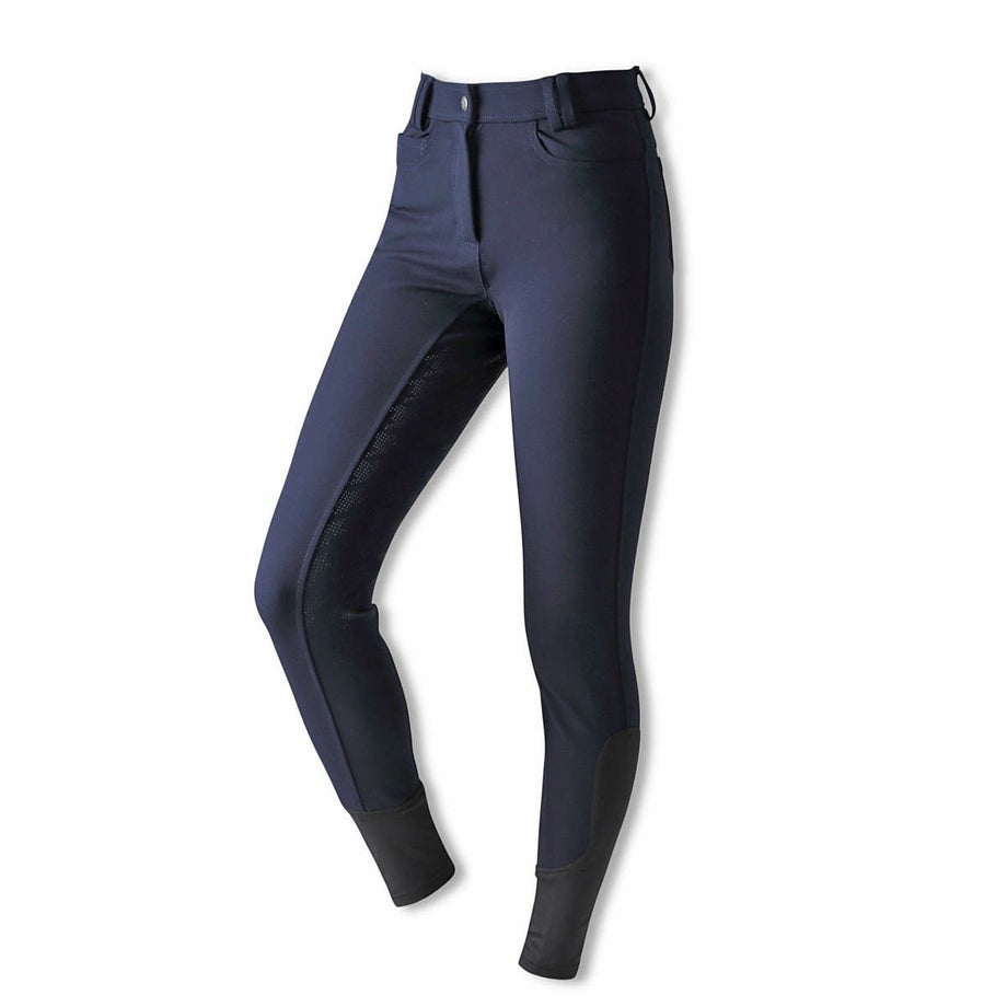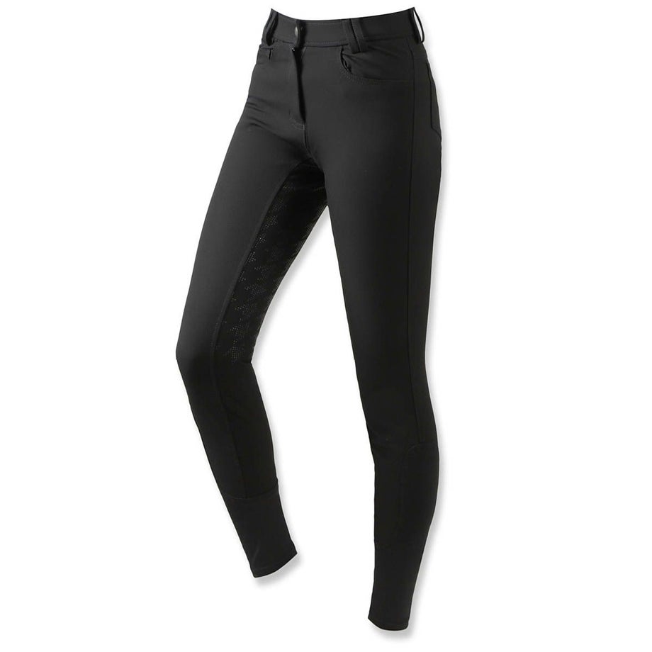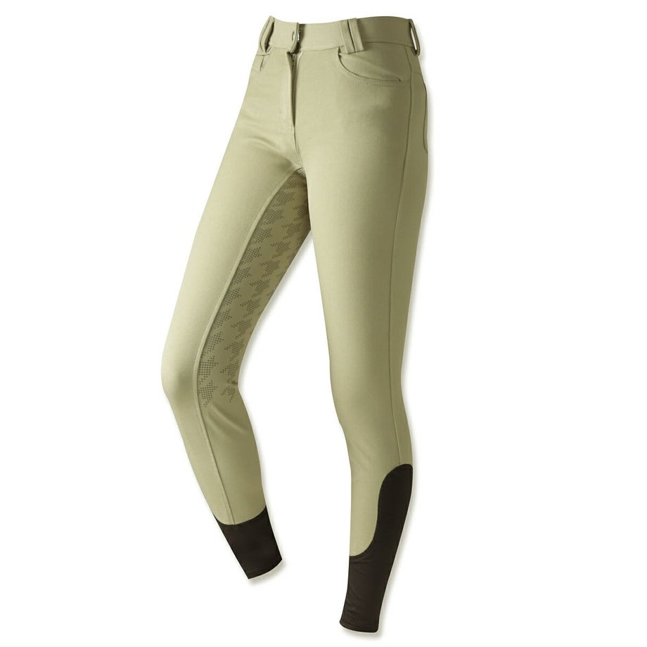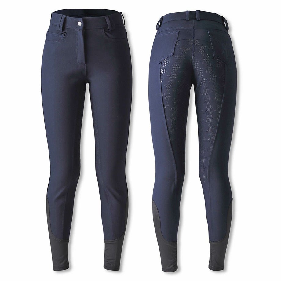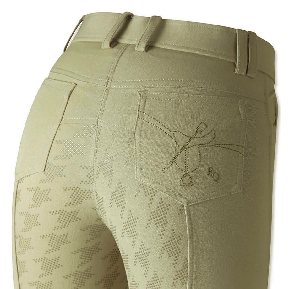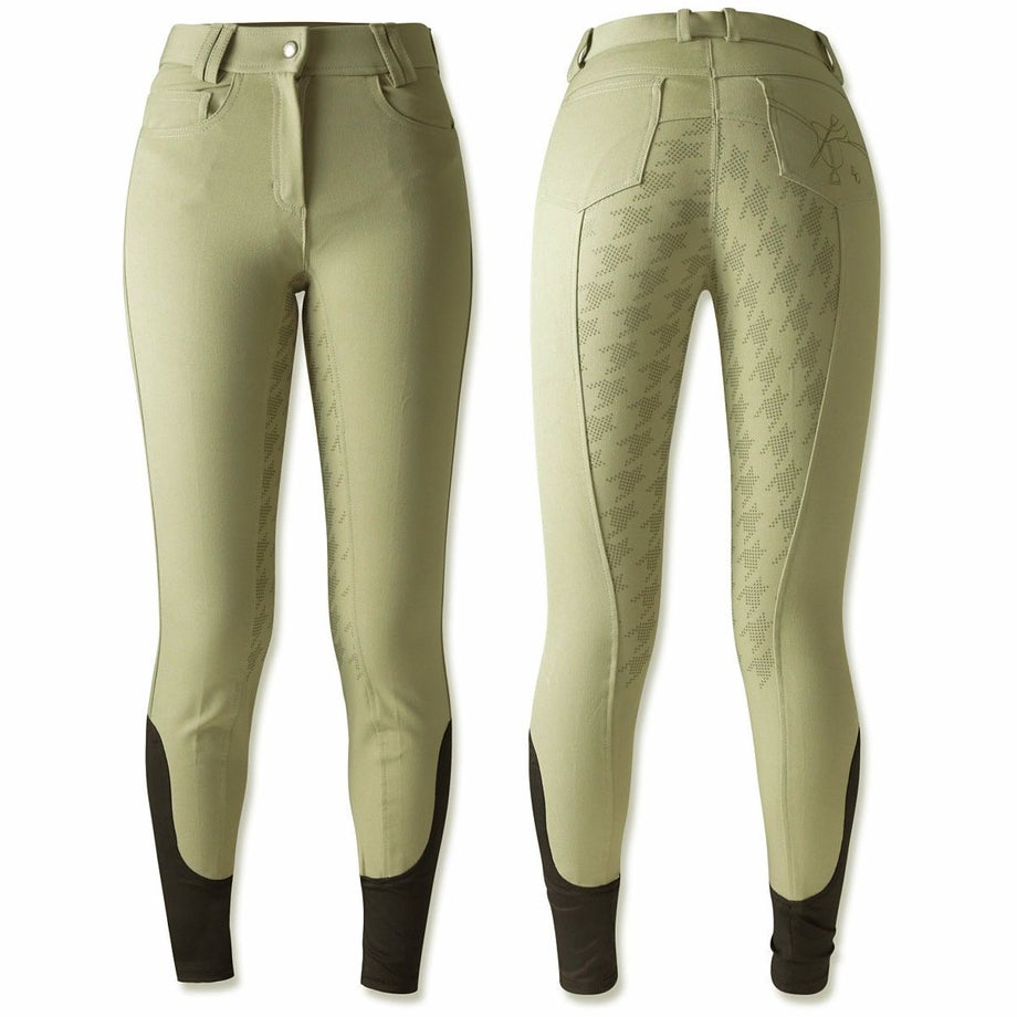 しっかりした丈夫な生地なのに伸びがよく、身体にフィットして動きやすいとユーザーから高く評価されているベストセラーのオールシーズンキュロット。コインポケットやバックポケットのステッチなどデニムっぽさを取り入れながらカジュアルすぎずシンプルで落ち着いた雰囲気。バックポケットステッチはよく見ると馬の背に乗った鞍のデザイン。さりげないこだわりです。薄すぎず厚すぎず、オールシーズン着まわせる使いやすさ。ビギナー・ベテランを問わず1着は持っていたいアイテムです。・人気のシリコングリップを採用従来の合皮タイプに比べ、グリップ力が大幅に向上し、ごわつきがなく、伸びやすく、通気性や吸汗性も高いシリコンタイプは、段違いの使いやすさと履き心地。今まで合皮だった部分が通気性の良い生地になったので、涼しさも大幅にUPしました。シリコンプリントは英国伝統のハウンドトゥース柄。エレガントでクラシックな印象のデザインです。シリコンはグリップが効きすぎると逆に使いにくくなることもあります。本製品では様々なシリコン形状をテストして、ちょうど良いグリップに調整しました。・日本人の騎乗姿勢にあったデザイン熟練デザイナーとパタンナーが、生地の特性を考慮して型紙からデザインしたキュロットは、姿勢の美しさと動きやすさを両立しました。ウエストのフロントが浅くバックが深いデザインは、騎乗時の座り込んだ姿勢でウエストをきっちりカバー。股部分を工夫してまたがりやすく、ひざ部分にゆとりをもたせ曲げやすくし、騎乗のしやすさを追及したシルエットに仕上がっています。・高い縫製技術を活かしたフィット感生産はヨーロッパ向けキュロットを手がけるメーカーが協力。長年培われた技術が活かされた縫製は耐久性とフィット感が抜群です。・素材へのこだわり生地やボタンなど全ての素材にこだわりました。ボタンは騎乗に適したものをドイツから取り寄せ。生地は国内の専門機関による厳しい試験に合格したものを採用しています。・足首周りはストレッチ素材で快適足首周りにストレッチ素材を採用。ふくらはぎまでストレッチ素材を伸ばすことで抜群のフィット感と快適な履き心地を実現しました。