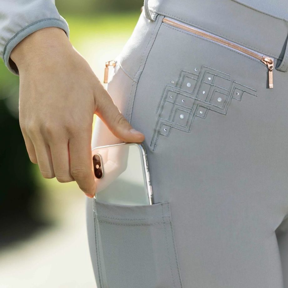 ・スリムフィットとハイウエストで美しいシルエットを強調。・右腿に携帯電話ポケットを装備しており、使いやすさ抜群。・ボタン留めとジッパー仕様で着脱が簡単。・リブ加工の袖口が動きやすさとフィット感を提供。・フロントポケット部分のラインストーンがエレガンスをプラス。・バックにはローズゴールドのジッパー付きフェイクポケットがあり、さり気ないおしゃれを演出。