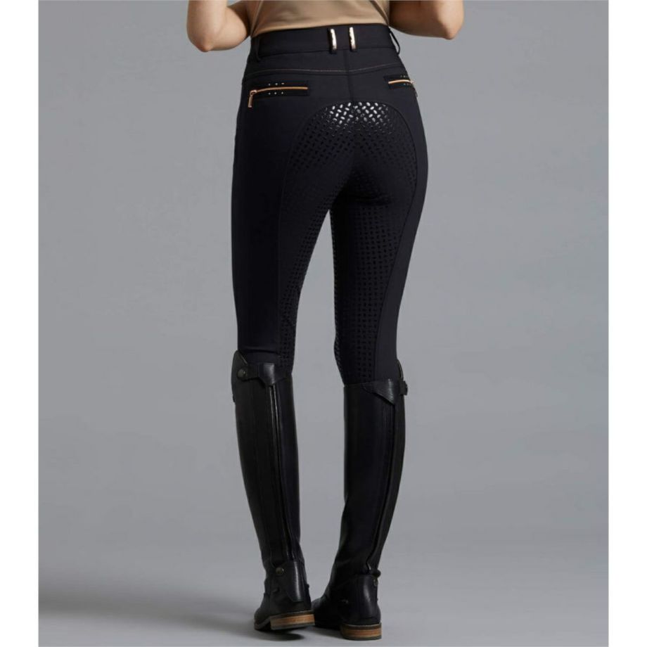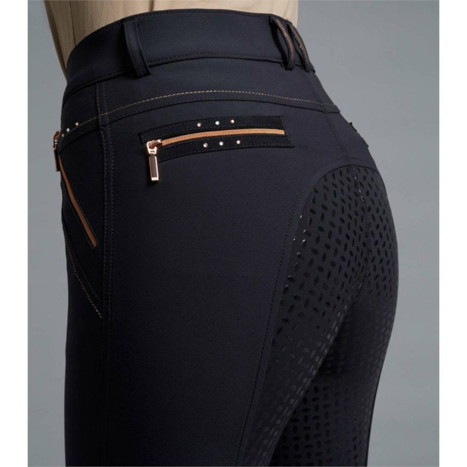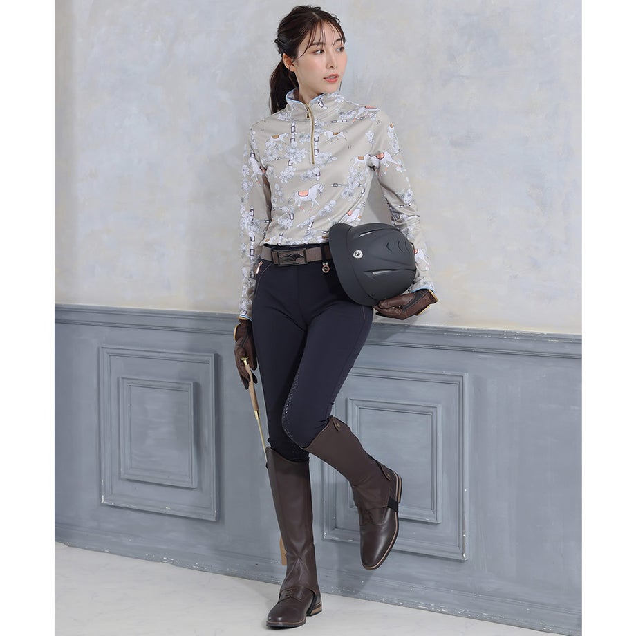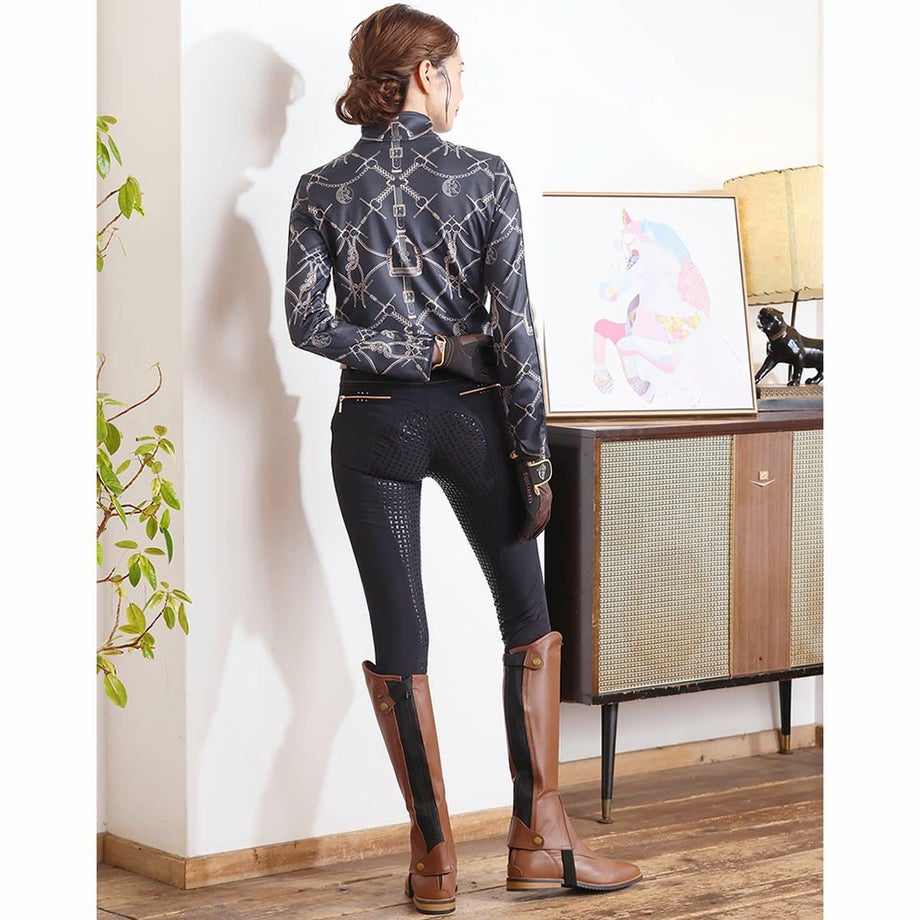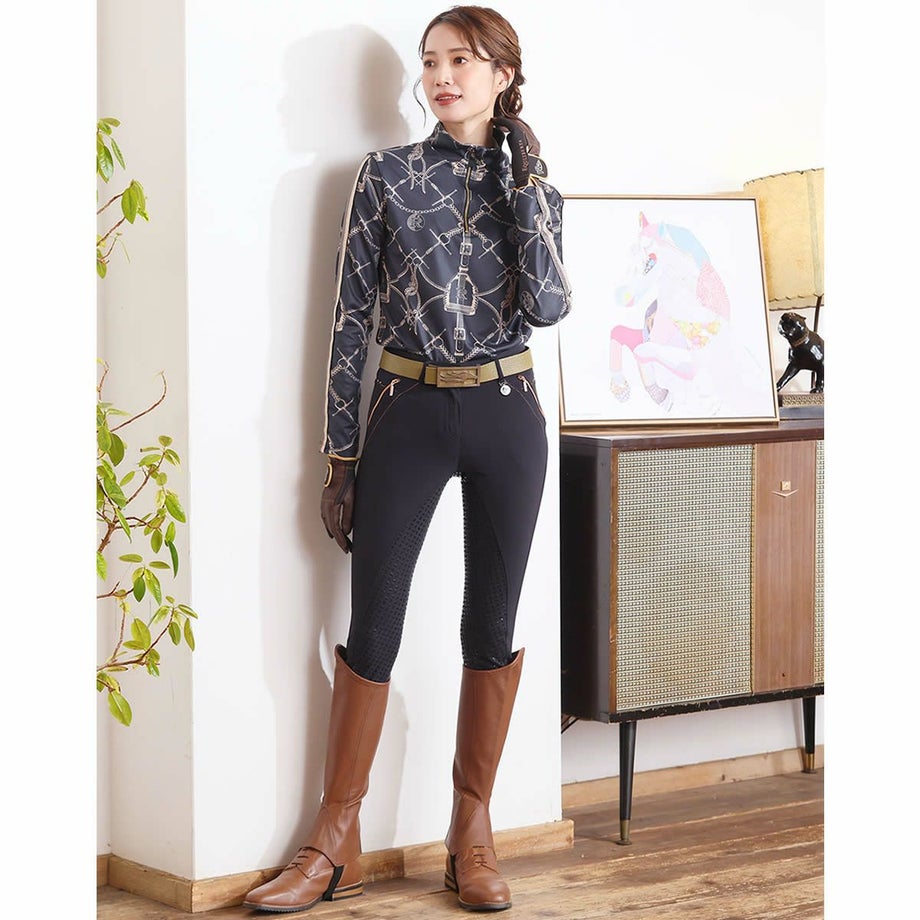 ・ローズゴールドのアクセント使いがポイントの乗馬用キュロットフルグリップ。・激しい動きにもフィットする伸縮性が高いテクニカルファブリック。・シャリ感のあるしっかりとした生地で通気性があります。・滑りにくいシリコングリップ。・ローズゴールドの華やかなクリスタルやジップ金具をあしらいました。・左前にロゴチャーム。・ジップ付きポケット:フロント2ヶ所、バック2ヶ所。・足首周りは伸縮性が高い素材なのでスムーズに着脱できます。