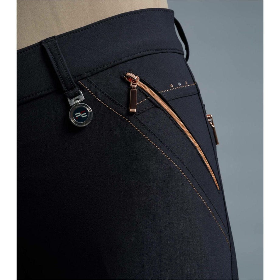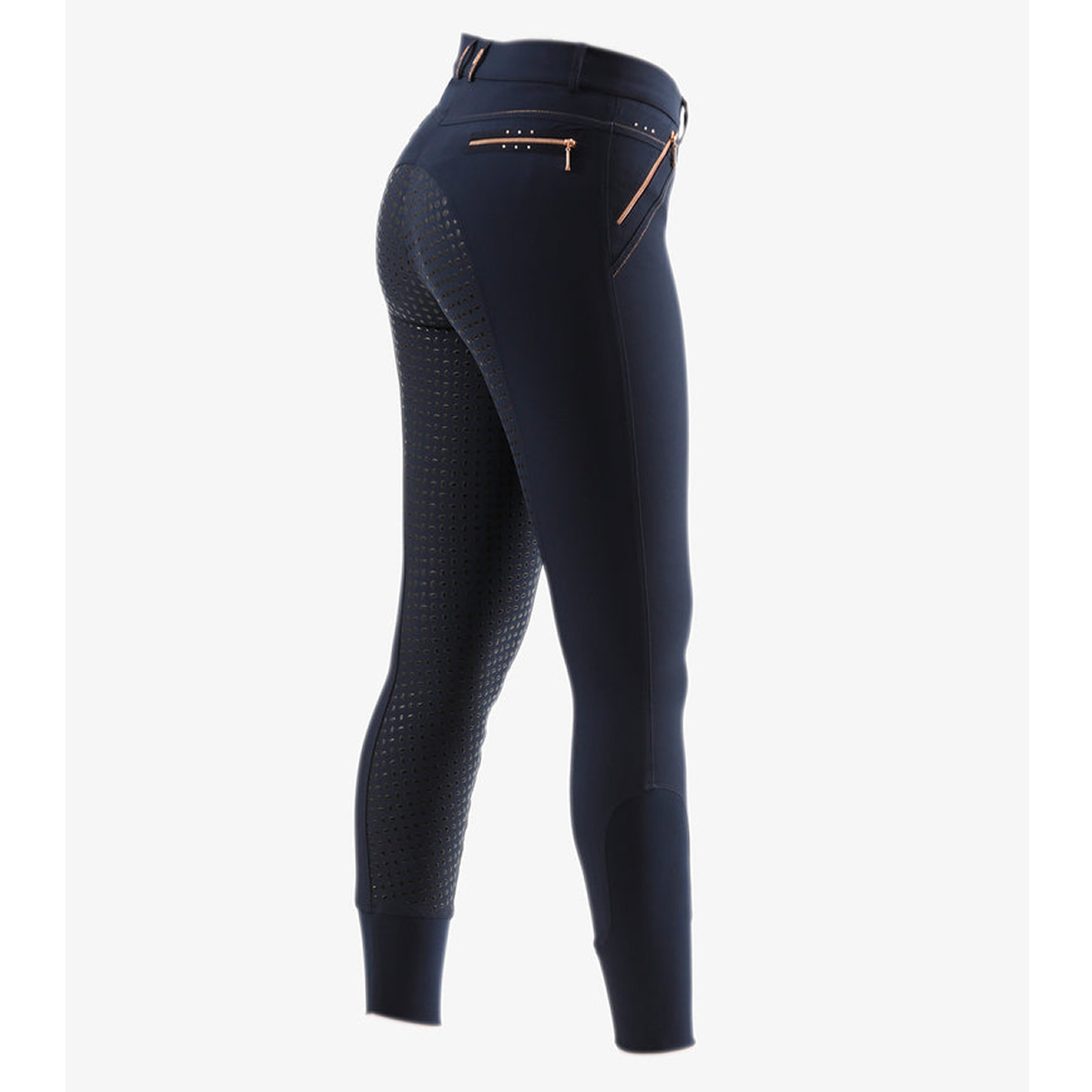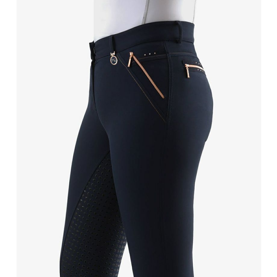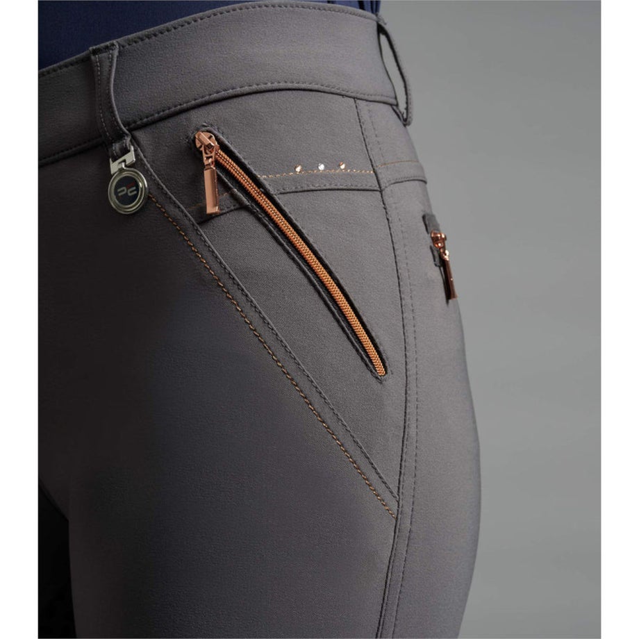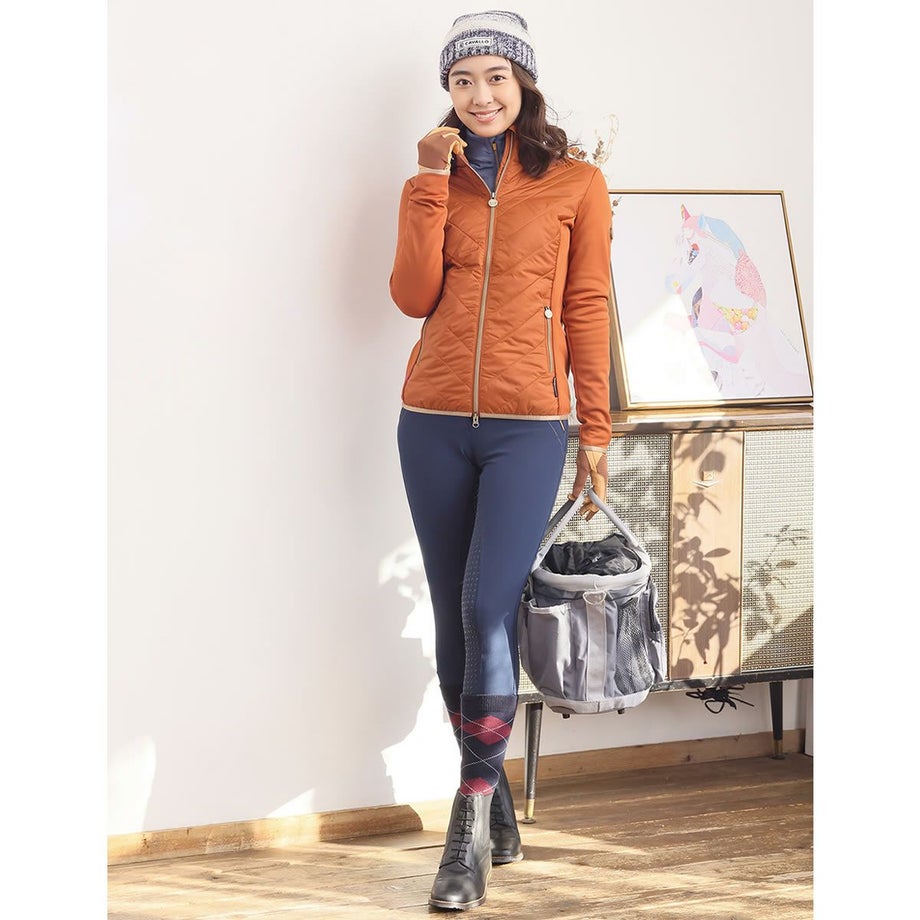 ・ローズゴールドのアクセント使いがポイントの乗馬用キュロットフルグリップ。・激しい動きにもフィットする伸縮性が高いテクニカルファブリック。・シャリ感のあるしっかりとした生地で通気性があります。・滑りにくいシリコングリップ。・ローズゴールドの華やかなクリスタルやジップ金具をあしらいました。・左前にロゴチャーム。・ジップ付きポケット:フロント2ヶ所、バック2ヶ所。・足首周りは伸縮性が高い素材なのでスムーズに着脱できます。