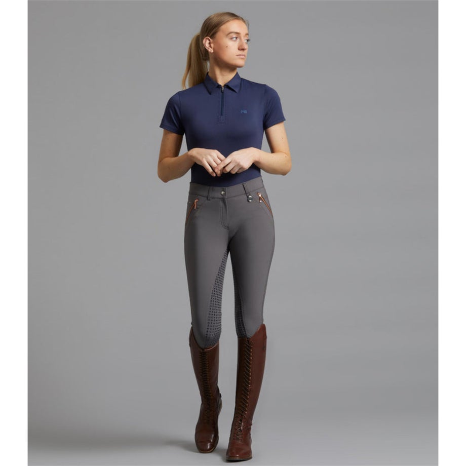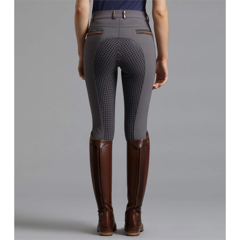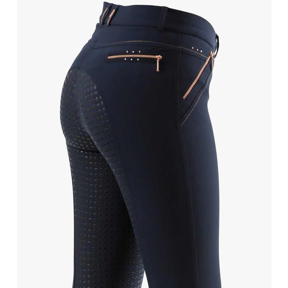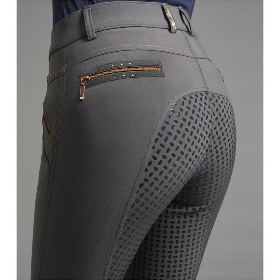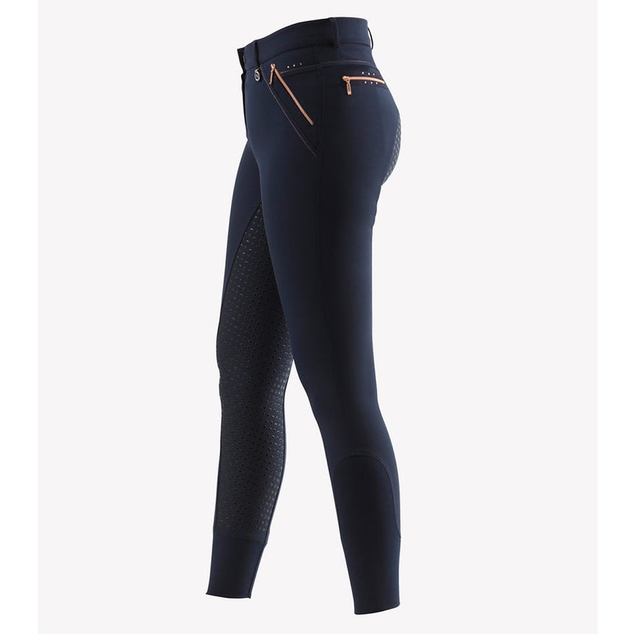 ・ローズゴールドのアクセント使いがポイントの乗馬用キュロットフルグリップ。・激しい動きにもフィットする伸縮性が高いテクニカルファブリック。・シャリ感のあるしっかりとした生地で通気性があります。・滑りにくいシリコングリップ。・ローズゴールドの華やかなクリスタルやジップ金具をあしらいました。・左前にロゴチャーム。・ジップ付きポケット:フロント2ヶ所、バック2ヶ所。・足首周りは伸縮性が高い素材なのでスムーズに着脱できます。