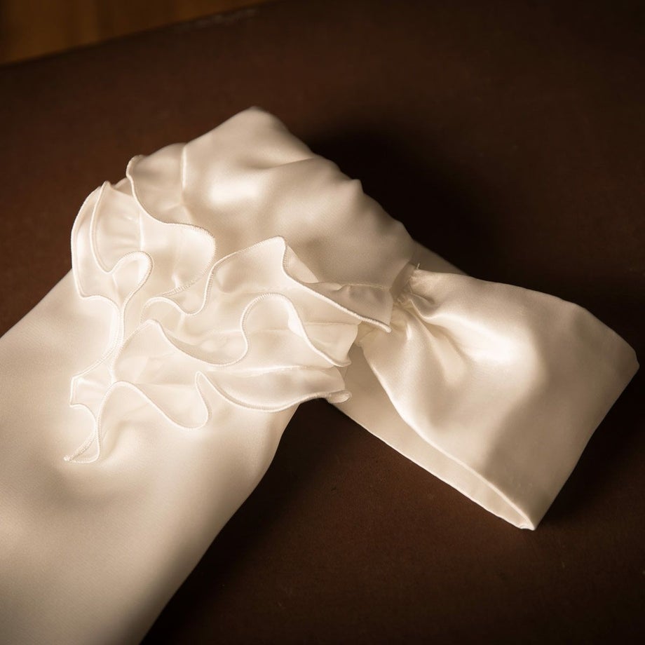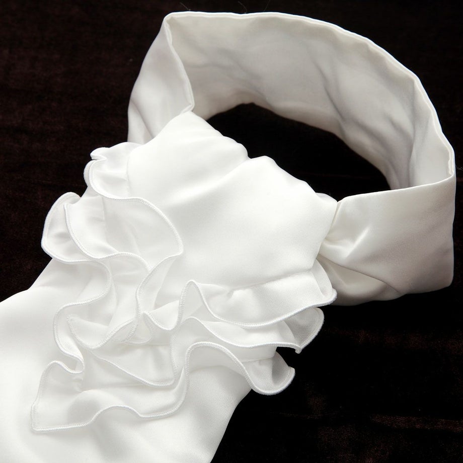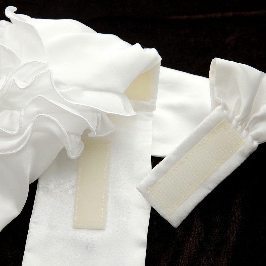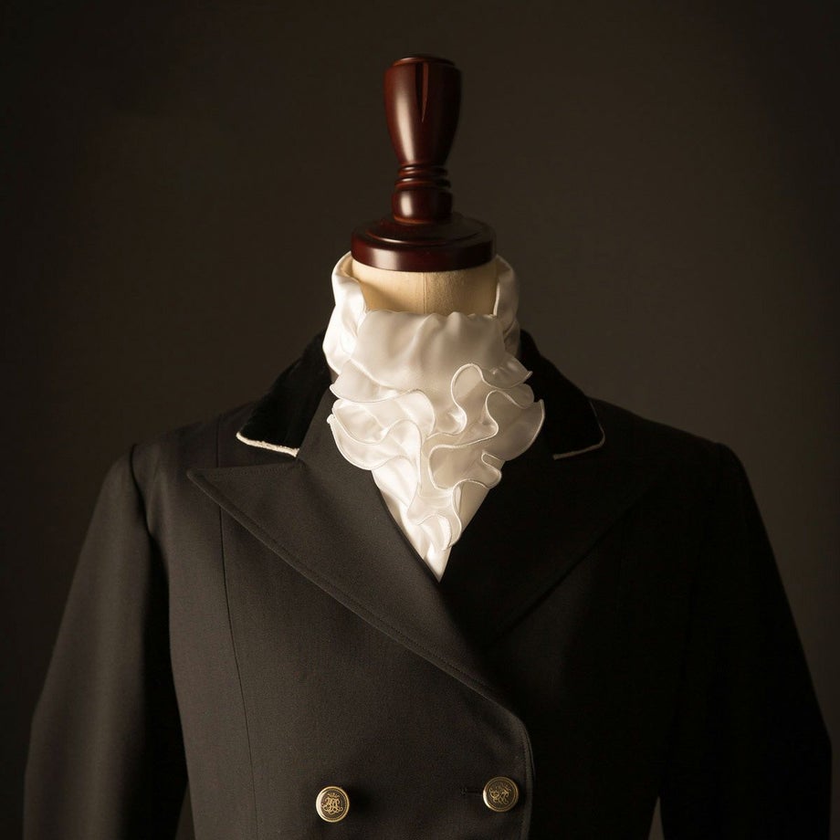 今までにない、まさに自分が欲しかったアスコットタイを商品化しました!!この商品だけを見るよりもジャケットを羽織ったときのことを想像してみてください。シンプルなジャケットが激変します!!フリルの裏側にベルクロを取り付けることでボリュームが出しやすい工夫もしました。また見た目だけでなく、競技前の忙しいときにも簡単に装着できるよう首元の留めを前に持ってきてよりサイズ調整しやすくなっています。見た目・機能性、どれをとっても超オススメです☆★(anego)