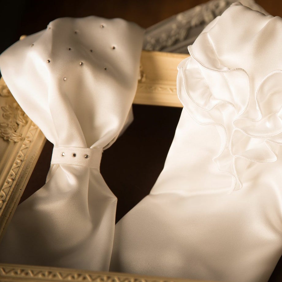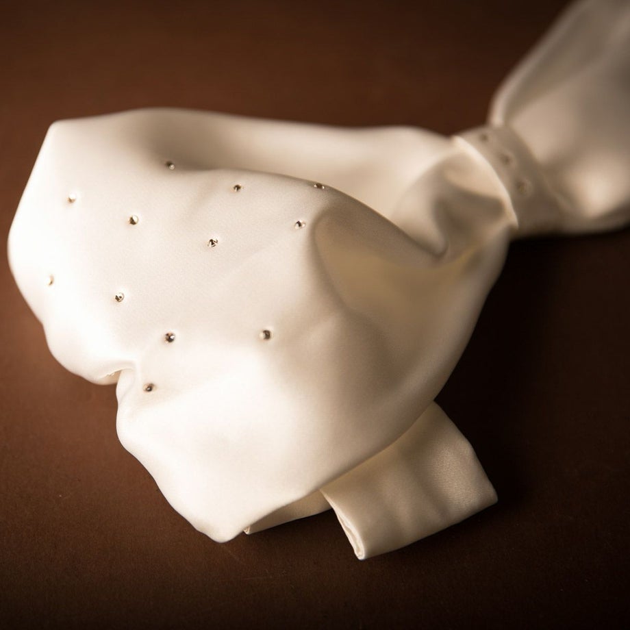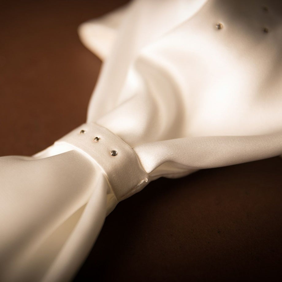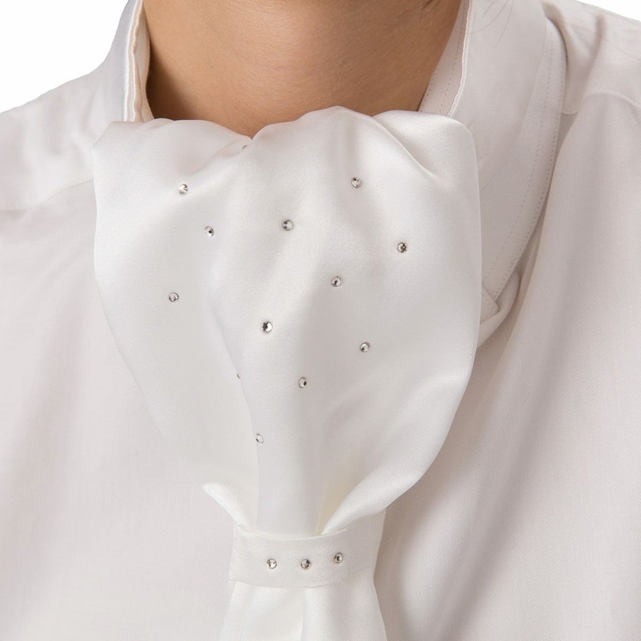 今までにない、まさに自分が欲しかったアスコットタイを商品化しました!!この商品だけを見るよりもジャケットを羽織ったときのことを想像してみてください。シンプルなジャケットが激変します!!光沢のある生地とひかえめにちりばめられたストーンがポイント。キラキラしすぎず上品な胸元になります。また見た目だけでなく、競技前の忙しいときにも簡単に装着できるよう首元の留めを前に持ってきてよりサイズ調整しやすくなっています。見た目・機能性、どれをとっても超オススメです☆★(anego)