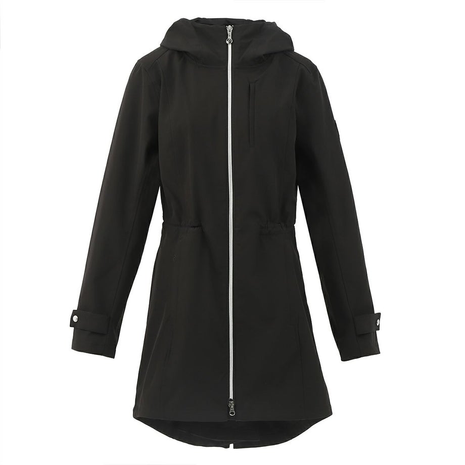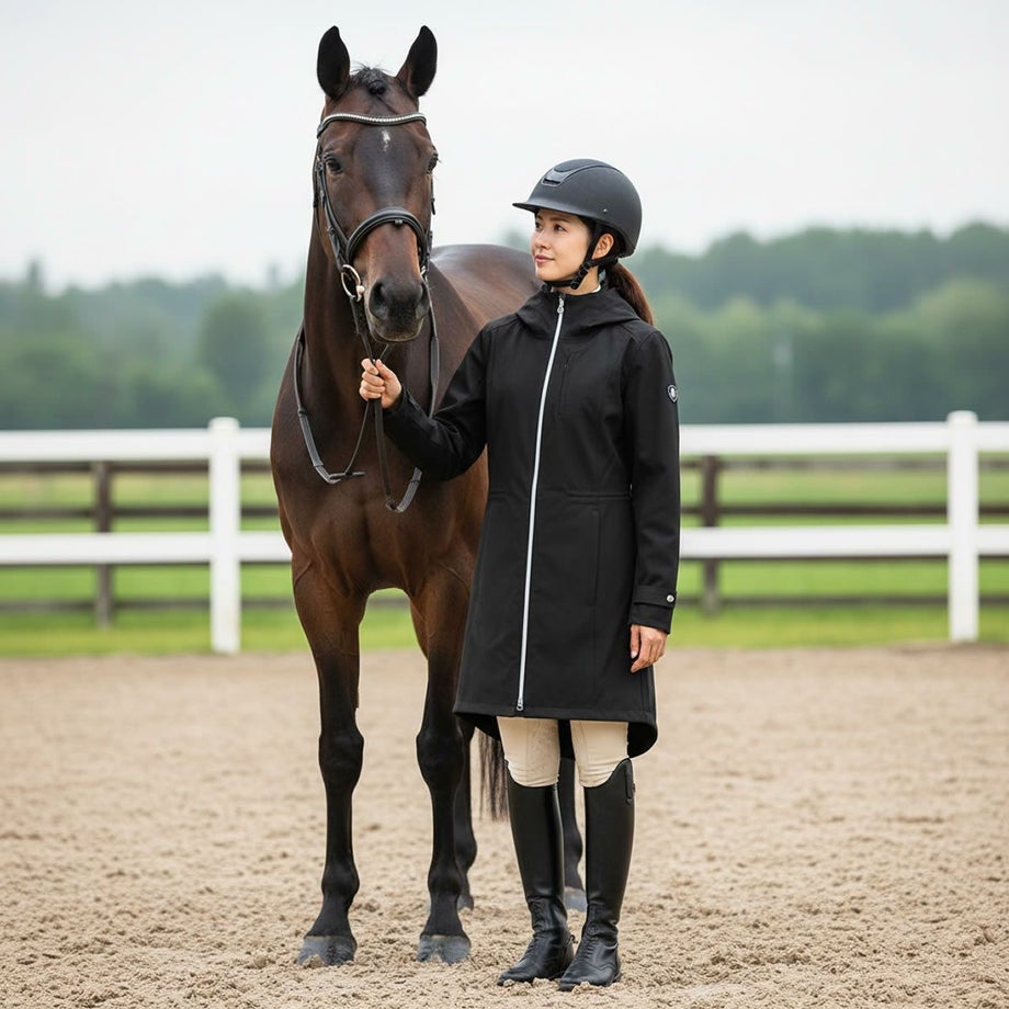 従来のロングテールジャケットからデザインをリニューアルし、スタイリッシュさとエレガントさがさらに向上しました。【フロントデザインの洗練】フロントのメインファスナーを、シルバー系のメタリオンファスナーに変更。高級感のある輝きが、全体をより一層スタイリッシュに引き締めます。【バックスタイルのエレガント化】以前の目立ちやすかった再帰反射材(リフレクター)の配色を廃止し、ジャケット本体と同じシルバー系のパイピングに変更。これにより、商品の持つエレガントなイメージに調和する、落ち着いたバックスタイルを実現しました。【品質と着映えの向上】縫製技術を改善し、旧モデルよりもさらに美しく丁寧な仕上がりに。ファスナーの変更と縫製の向上により、全体に締まりと統一感が生まれ、着る人をより一層スタイリッシュに見せるデザインに進化しました。・美しいシルエット横から見るとまるで燕尾服のように裾がすらりと流れ、正面からみるとフレアコートのように裾が広がるエレガントなシルエットは、デザイナーがこだわり抜いて仕上げたデザインです。・動きやすさを追求2WAYストレッチ生地なので動きやすく、裏地がなく軽量で疲れにくいです。前丈は膝上あたりまでの長さで足が動かしやすく、前後のファスナーを開ければ騎乗時も裾が邪魔になりません。・高機能生地独自の高機能生地プライムテックソフトシェルを採用。雨の日には撥水、寒い冬でも防風で体温を保持、汗をかいても透湿性を確保。真夏以外は着用できるオールラウンダーな便利アイテムです。・撥水機能多少の雨や雪なら気にせず騎乗できます。・透湿湿気を外に逃がす生地なので汗をかいても快適。・防風防風効果のある生地だから、冬場の騎乗でもしっかり保温されます。・防汚、防花粉汚れにくい生地でメンテナンスもらくちん。ご家庭での洗濯もOK。花粉もつきにくいので花粉症の方にもおすすめです。・UVカット紫外線カット機能により、馬場の日差しから肌を守ります。・様々な便利機能内側のゴムベルトでウエストを絞り込むことができます。袖口のボタンで微調整ができます。大きく開くジップ式のバックスリット。スリット内側にも生地がついているので、外に出して雨から鞍をカバーすることができます。左右のジッパー付きポケットの他、左胸に縦ファスナーのミニポケットがあり、カギなどの小物入れに便利です。・高級感のあるパーツ左腕のEQULIBERTAロゴが入ったワッペンや、刻印のあるボタン、ジップ金具など高級感のあるパーツがさりげなく使われています。後ろのウエストラインを装飾するライトグレーのパイピングはうっすらと光を反射して目を引きます。・乗馬以外にもサッと着れて軽くて高機能なアウターなので、乗馬以外の用途にもおすすめ。キャンプ、ロードバイク、ゴルフなどのアウトドアはもちろん、上品なデザインなので通勤などの普段使いにもおすすめです。