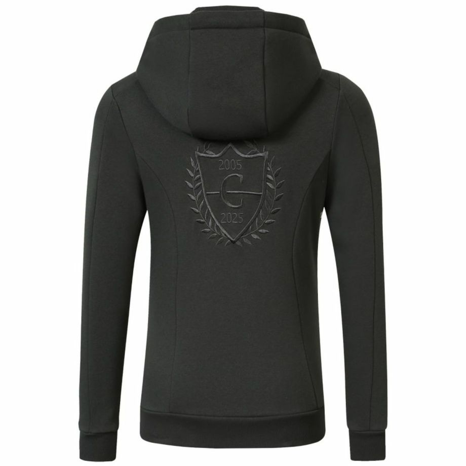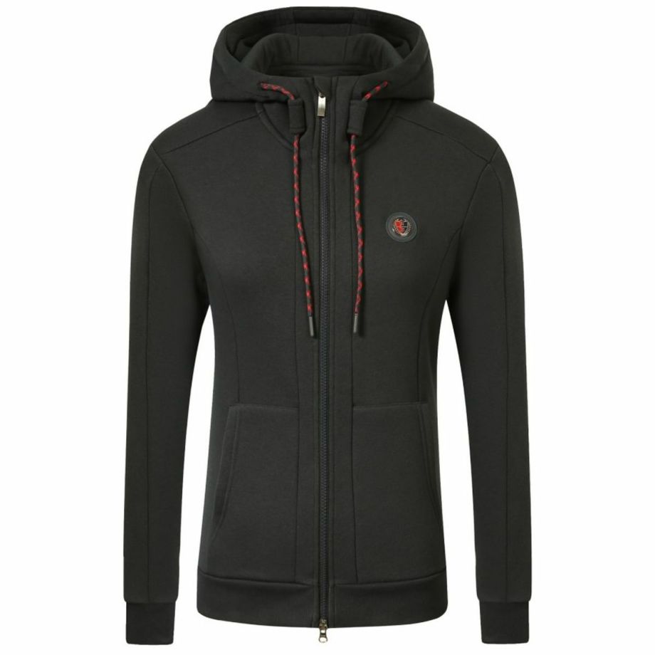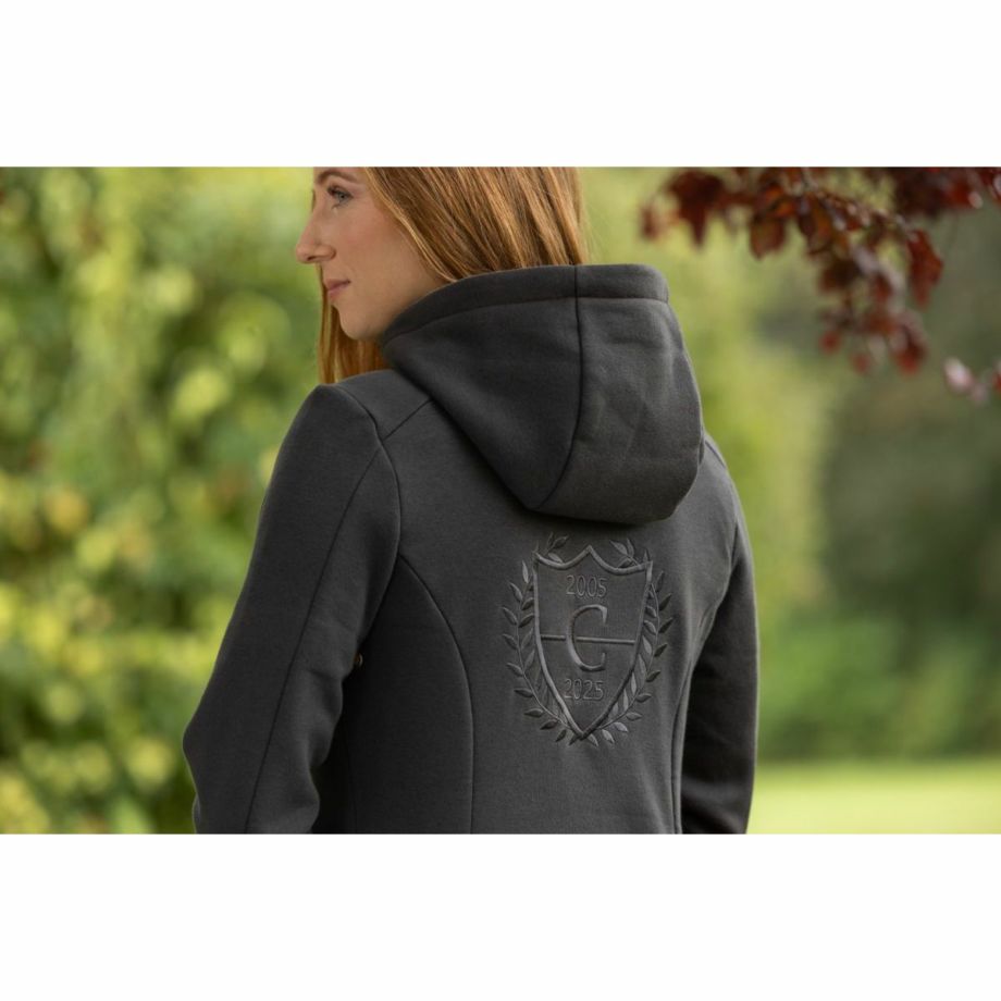 ・肌触りの良い天然コットン製で、快適な着心地。・女性らしいラインを美しく見せるウエストシェイプのカット。・上下どちらからも開閉可能な2WAYジッパーで、温度調節や着こなしが自由自在。・ボタンで固定可能なフードは動きを妨げません。・背中には上品なロゴ刺繍が施されており、デザインのアクセントに。・両サイドには手を温めるのに便利なハンドウォーマーポケット付き。・脇の下には通気口を配置しムレを軽減。・30°Cで洗濯機洗いが可能で、お手入れ簡単。デイリーユースに最適。・乗馬用としてはもちろん、普段使いにも活躍する機能性とデザイン。