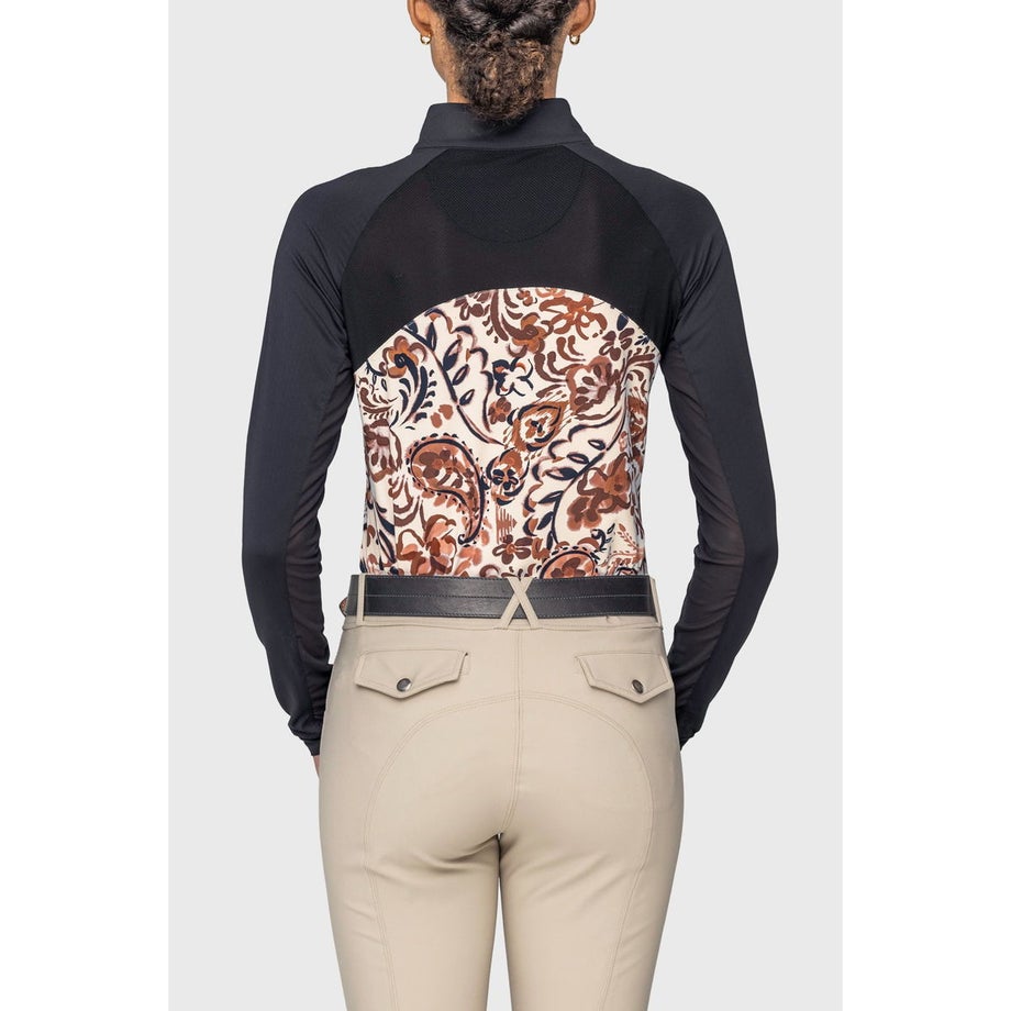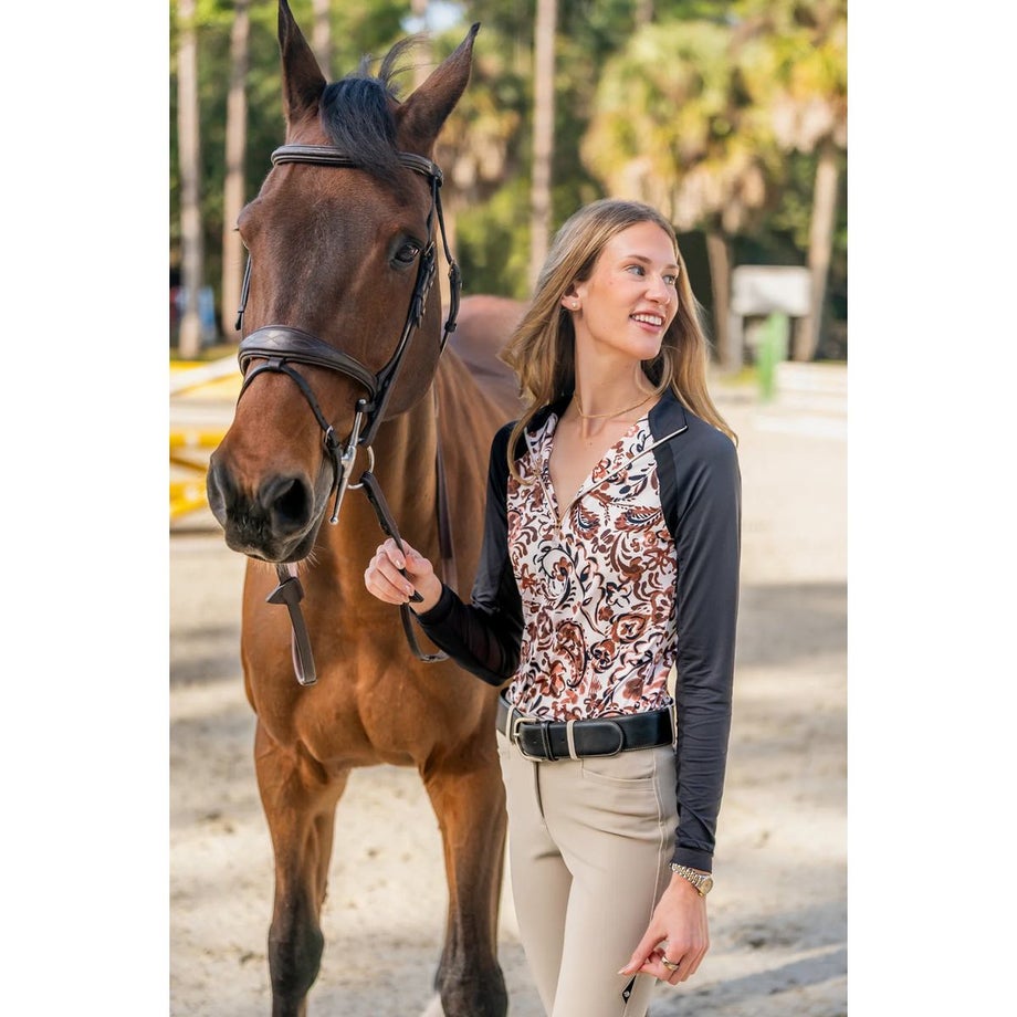 ・伝統的な絣模様を現代的にアレンジしたイカット柄が、モダンで洗練された個性を演出。・ラグラン袖の切り替えと背面のヨークにあしらわれたテクスチャード加工のブラックパネルが、スポーティーなシルエットを強調。・紫外線カット機能を備えた生地が、屋外での活動中も大切な肌を保護。・柔らかな4方向ストレッチ素材と袖下の通気性に優れたパワーメッシュが、常に涼しく快適な着心地。・抗菌防臭加工により、汗をかいてもニオイが気になりにくくアクティブなシーンでも清潔感を維持。・ローズゴールドの1/4ジップとスタイリッシュなスタンドカラーが、スムーズな体温調節と自在なスタイリングを実現。・乗馬はもちろんランニングやゴルフ、日常のカジュアルな装いまで、場所を選ばず幅広く活躍。