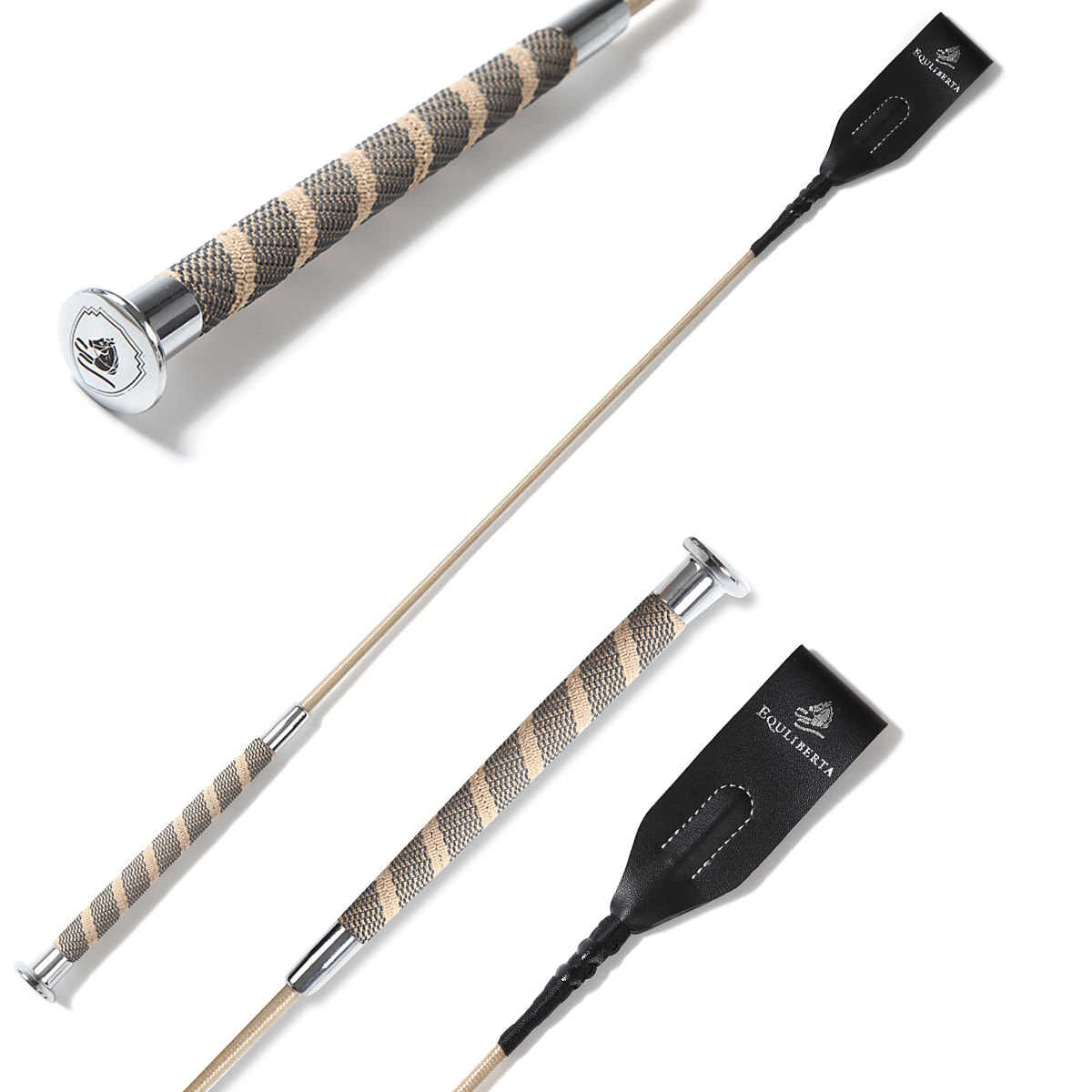 光沢のあるグリップエンドと「EQULIBERTA」のエンボス加工が施されたグリップがプレミアムな雰囲気の短鞭と、イージィムチケースのお得なセット。