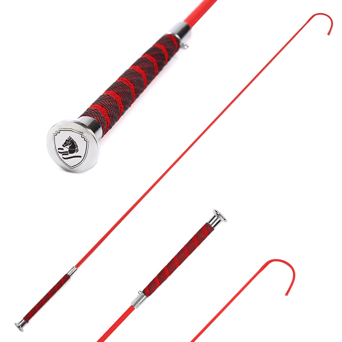 グリップにラバーを編みこんだ滑りにくい長鞭。グリップのメタルキャップが高級感たっぷりな仕上がりです。