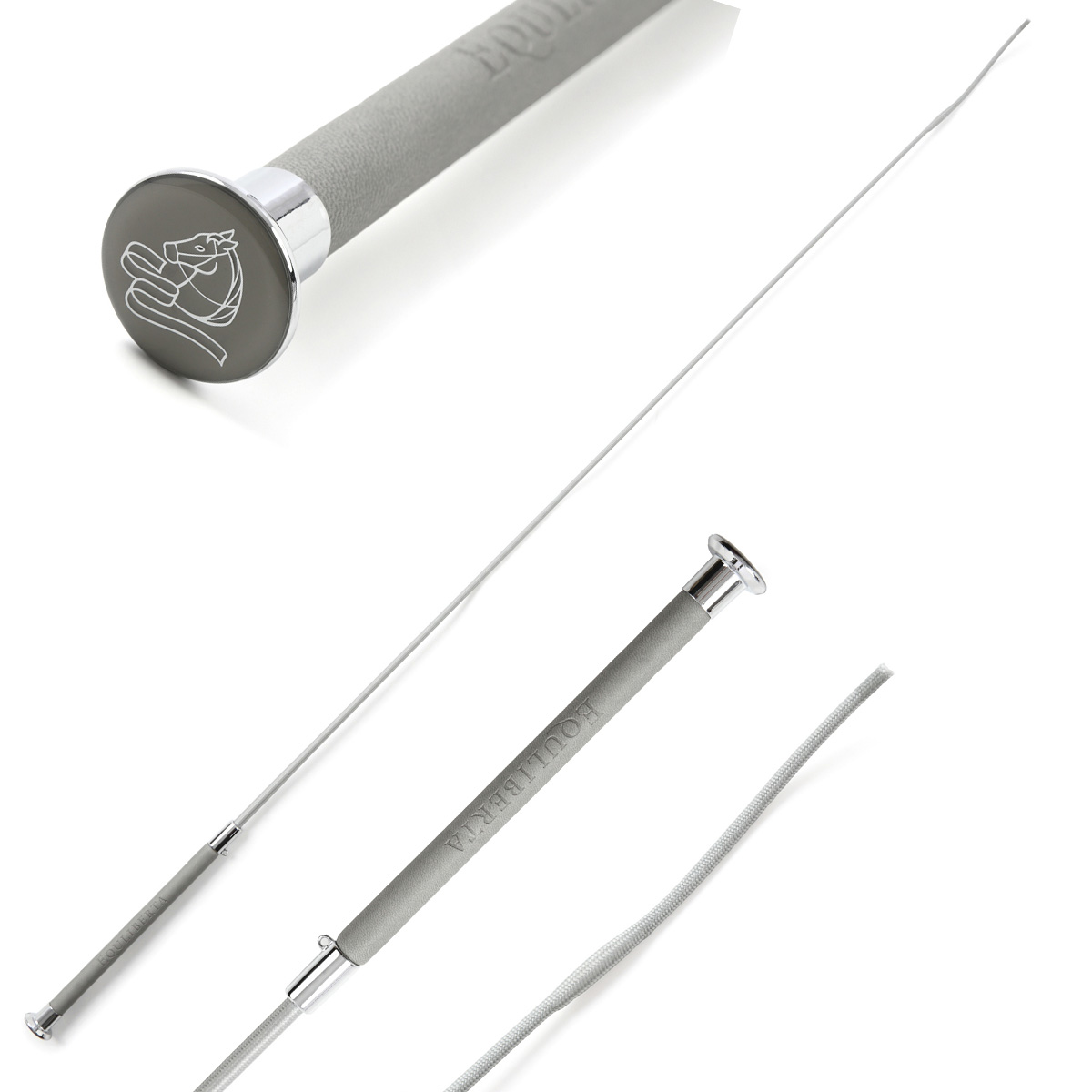 光沢のあるグリップエンドと「EQULIBERTA」のエンボス加工が施されたグリップがプレミアムな雰囲気の長鞭と、イージィムチケースのお得なセット。