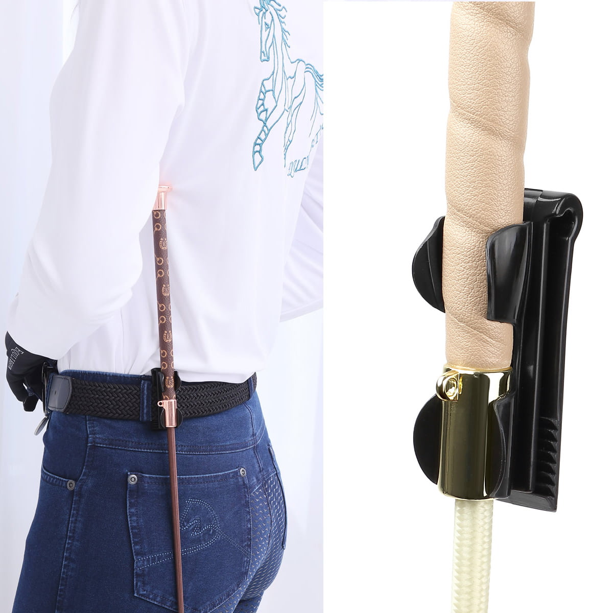 鞭をワンタッチでホールドできるクリップ。手元がフリーになるから馬装や洗い場作業が楽に!置き忘れ防止にも。