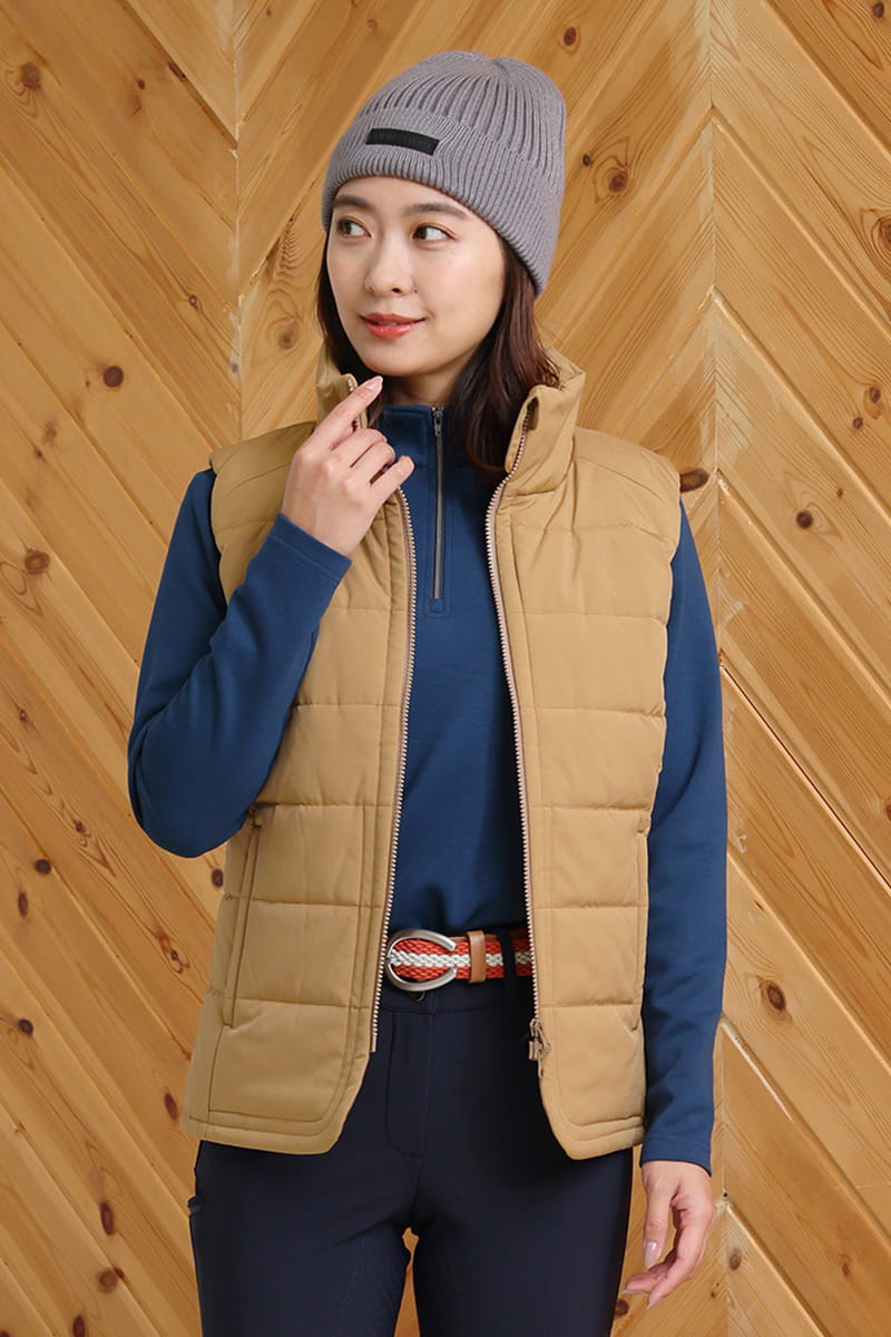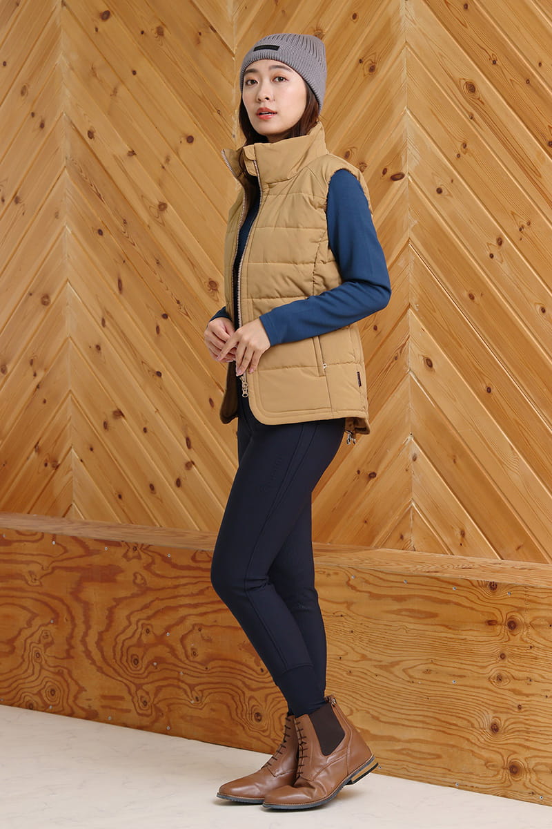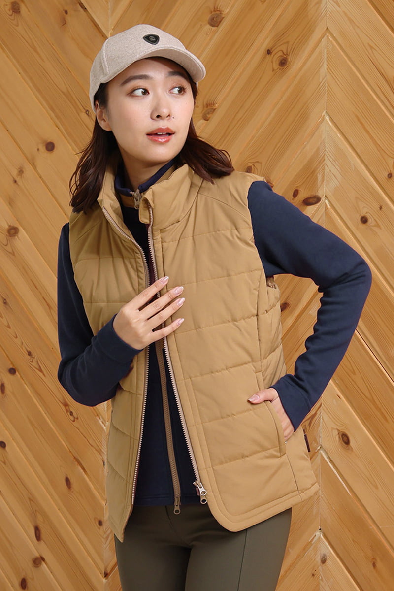 「EQULIBERTA フレックス ボディウォーマー」をレイヤードすることで、防寒性とトレンド感を両立したスタイルに。