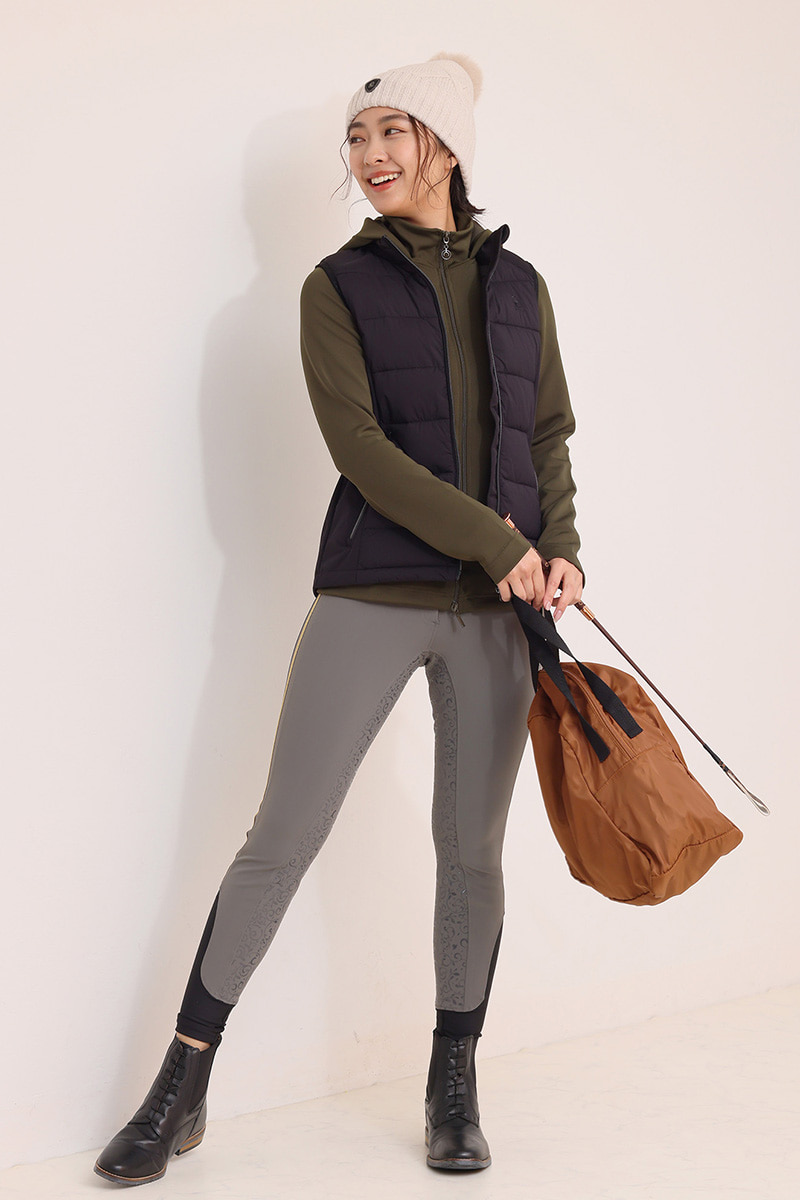 キュロットは上質な素材と丁寧な作り込みが特徴の、グレーの高機能キュロットをチョイス!サイドのゴールドのラインがアクセントです。