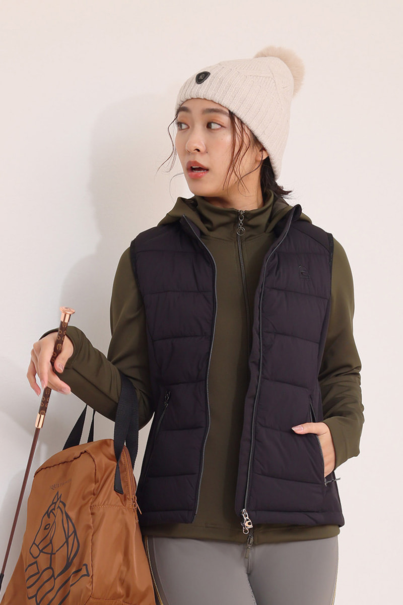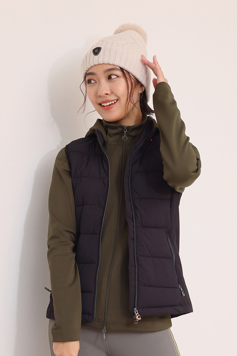深みのあるカーキのトップスに、ネイビーのダウンベストを合わせたクールウォーミーなコーディネート。