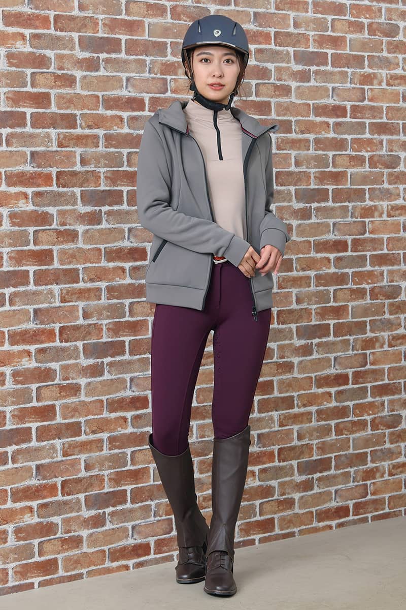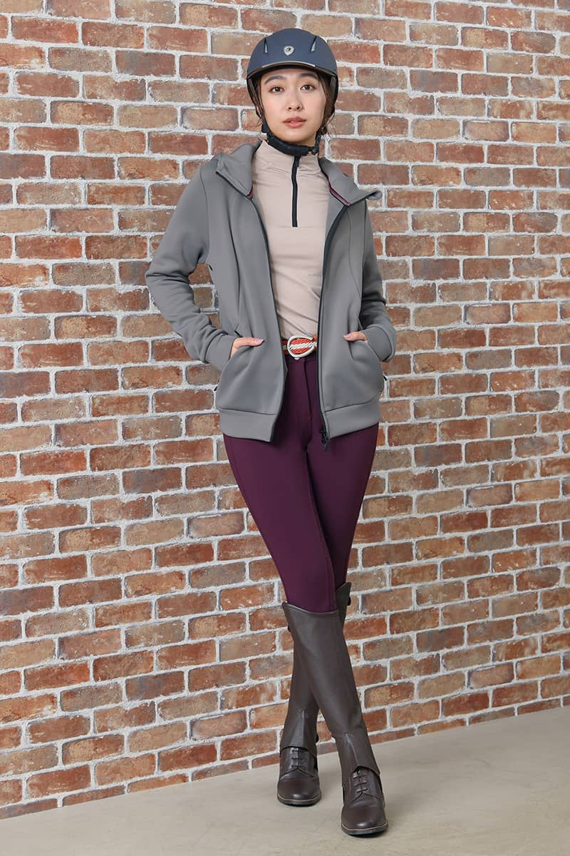 ベーシックなグレーのフード付きジャケットに、深みのあるパープルのキュロットを組み合わせてクールビューティーなスタイルに。