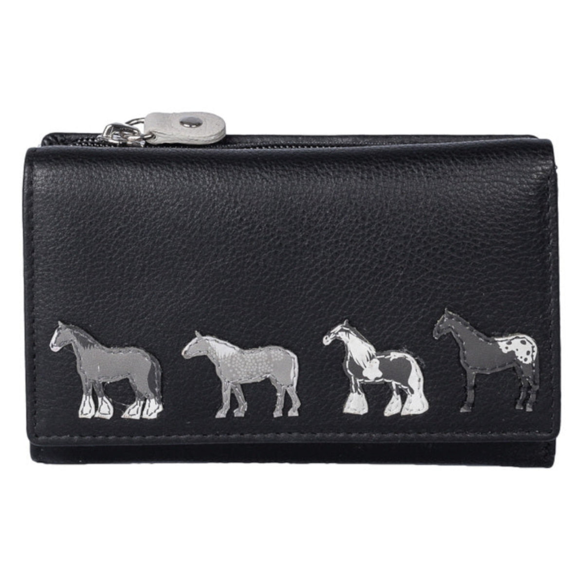 実用的でセンスが出せる三つ折り財布。お札や小銭、カードをスマートに収納できる。上質レザーを選び、毛色の違う馬のアップリケで素敵に仕上げた逸品です。