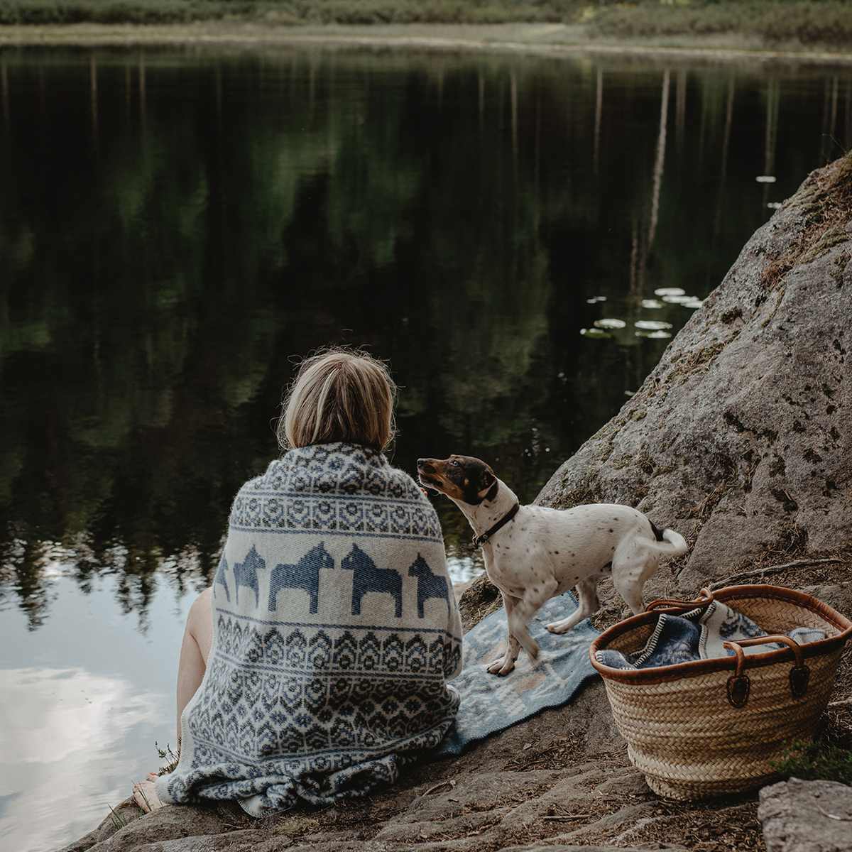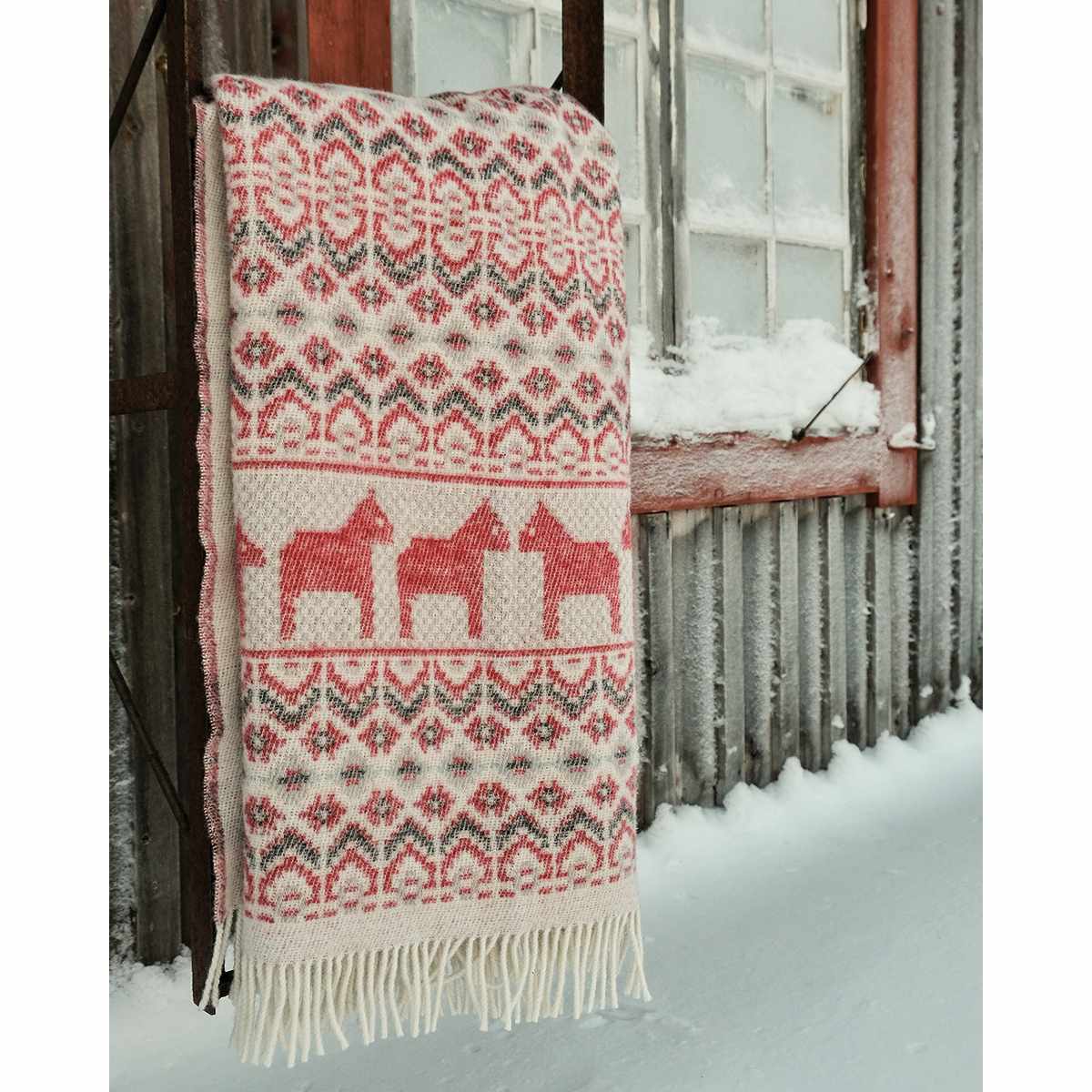 スウェーデンのダーラナホースをモチーフにした北欧デザイン。メリノウール100%使用で柔らかく保温性抜群。ペットにもやさしい厚手の高品質ブランケット。