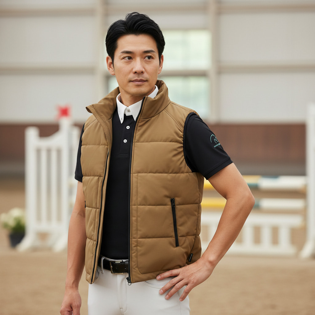 冷えやすい体幹を守りつつ肩周りを解放することで、手綱を通した愛馬との繊細なコンタクトを邪魔しない軽快さを実現。