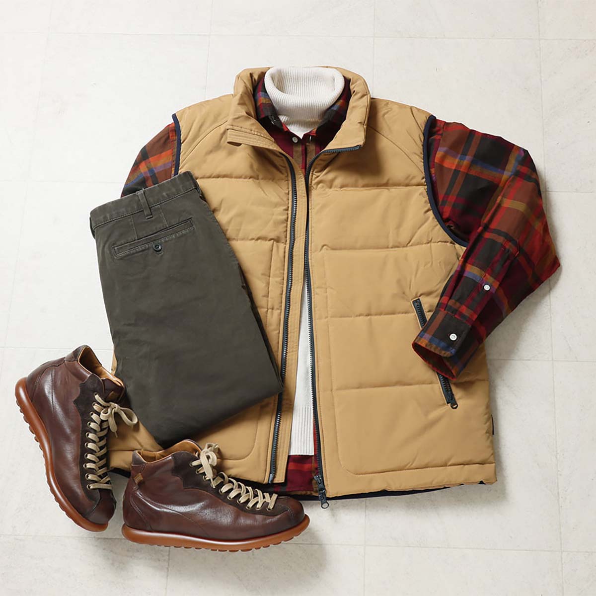 チェックシャツと白タートルの王道アメカジスタイルにベストをON。ボトムスはダークカラーでまとめて程よく重さを出して、大人の重厚感を演出。