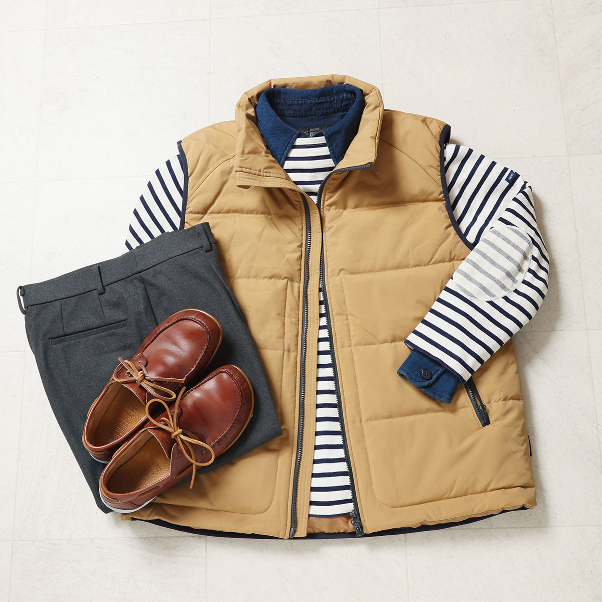 朝夕は肌寒いけど、動き出すと冬用ジャケットでは暑くなる。そんな春のジレンマを解消する「EQULIBERTA フレックス スリムベスト」を軸にしたスタイルをご紹介します。