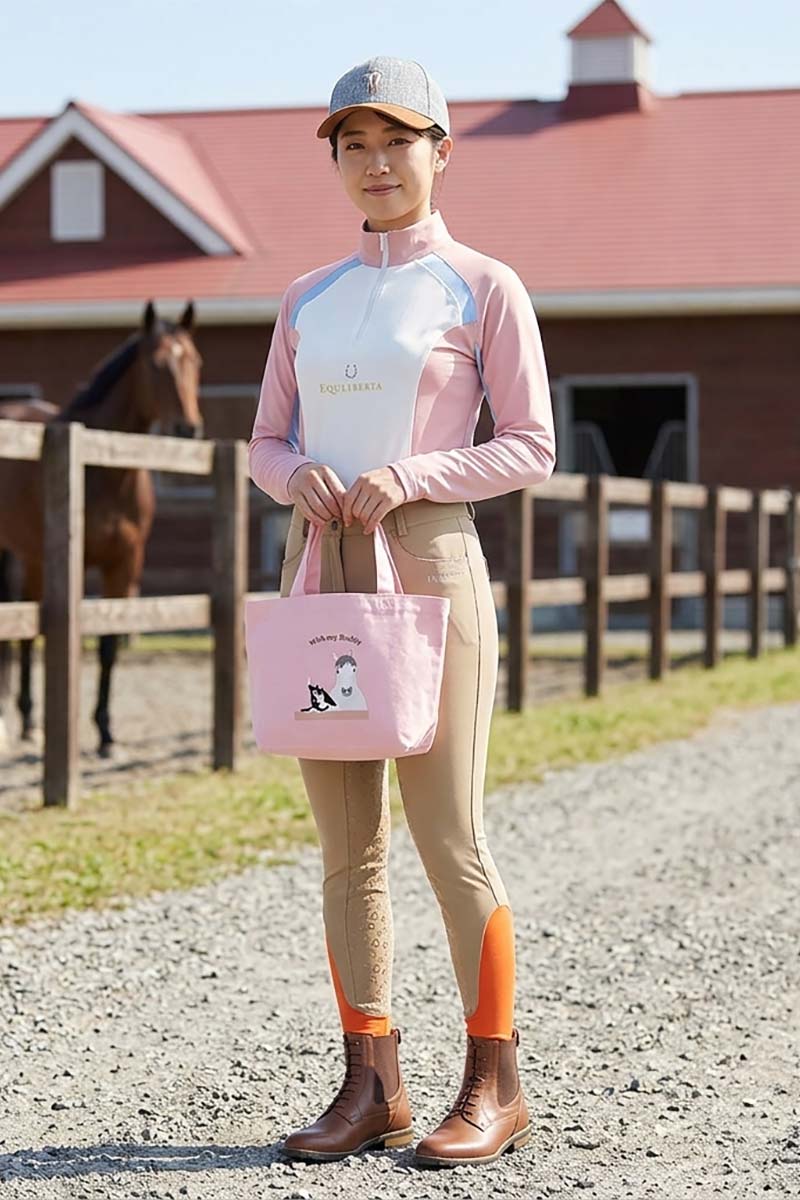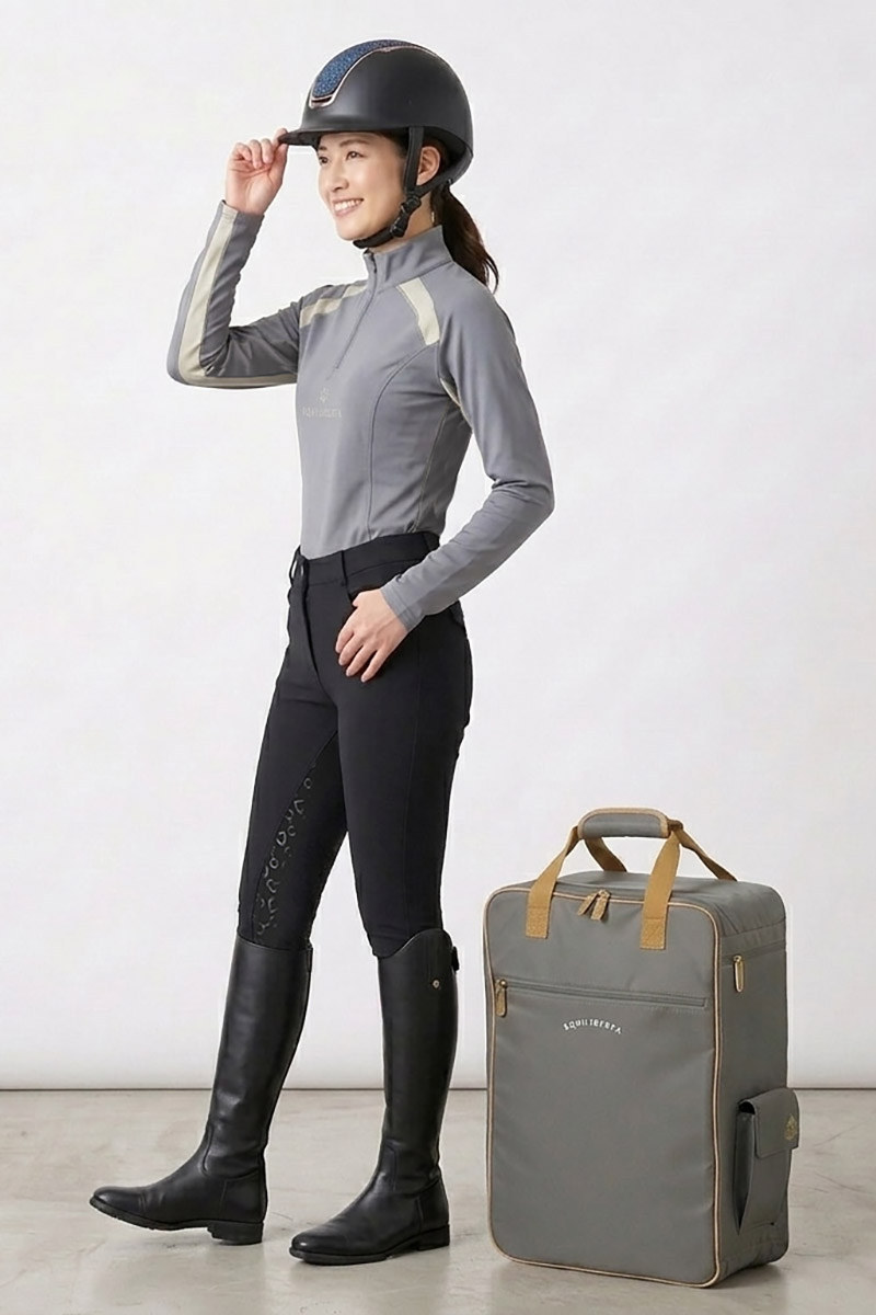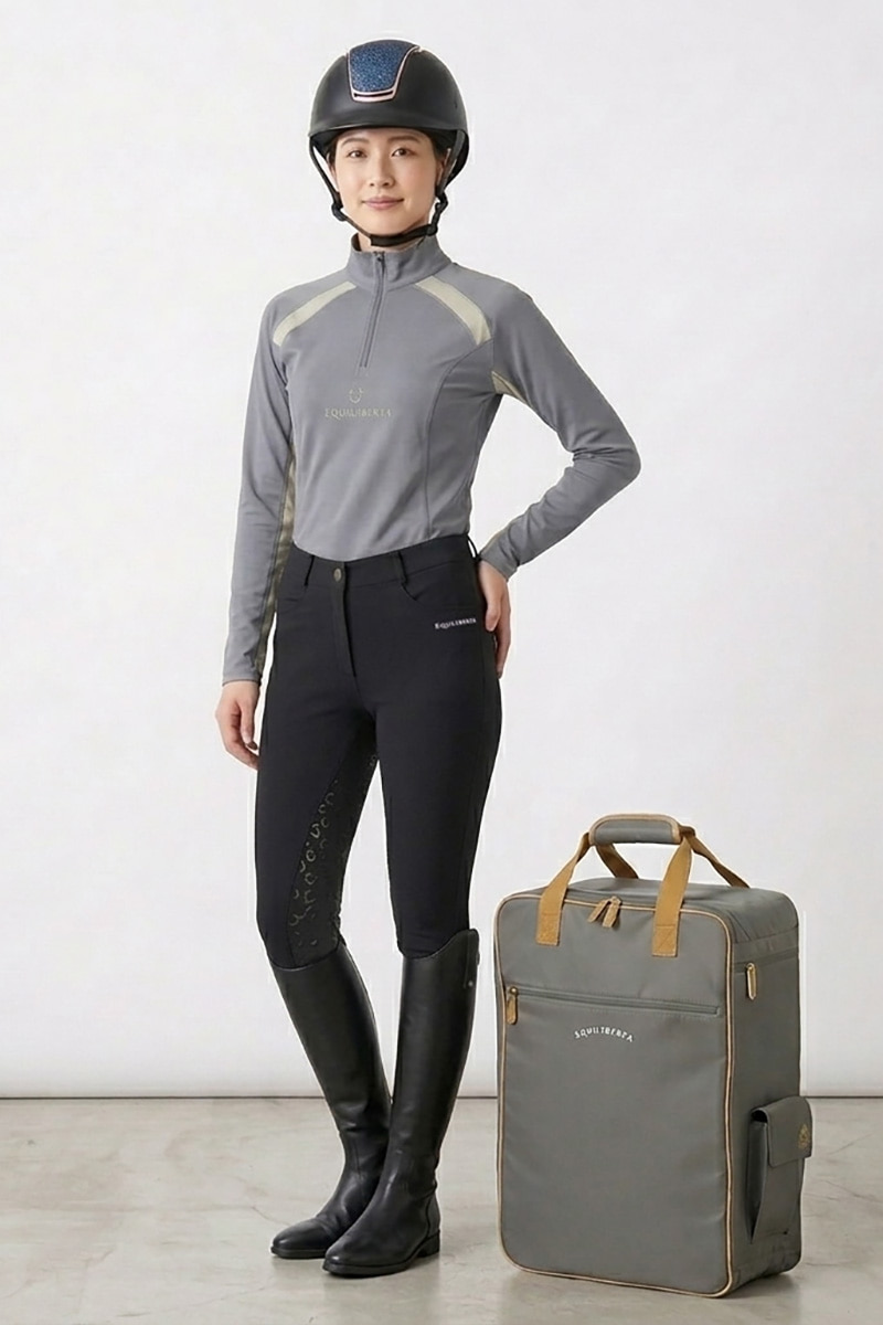 トップスのフロントに施されたクリスタルが日差しにきらめき、春夏の乗馬に華やかさを添えてくれます。