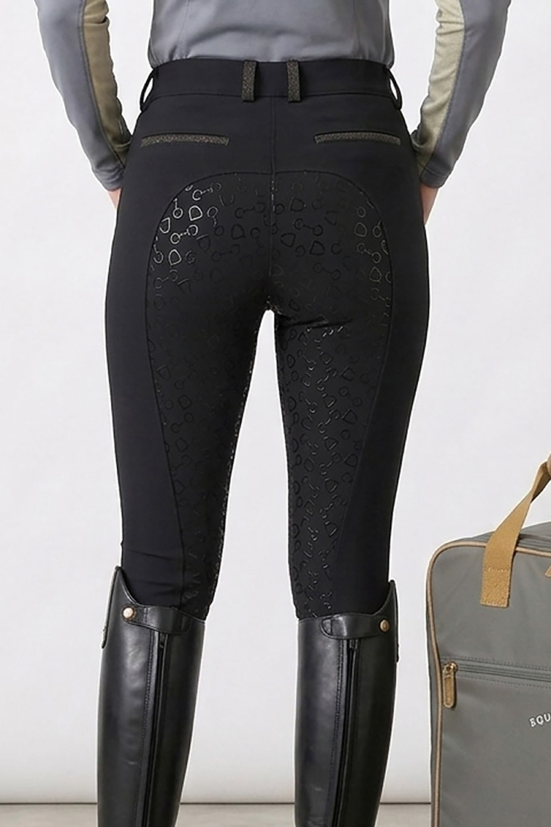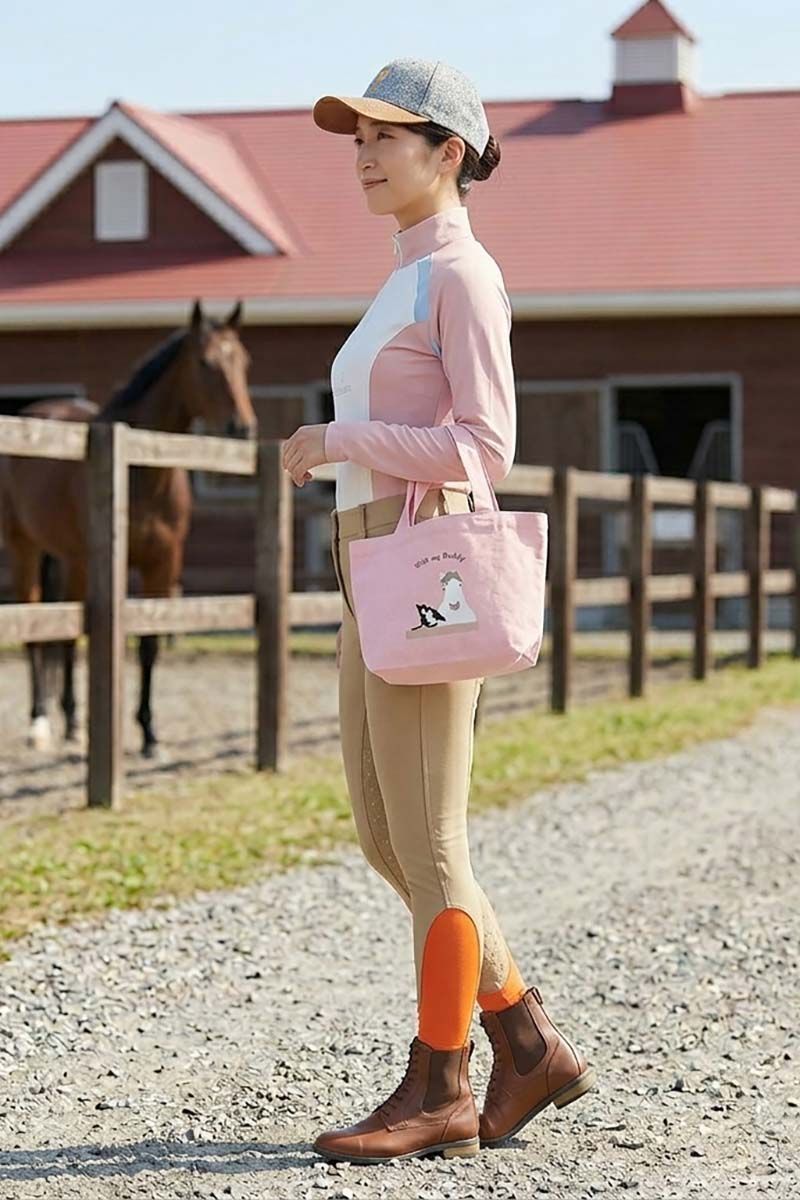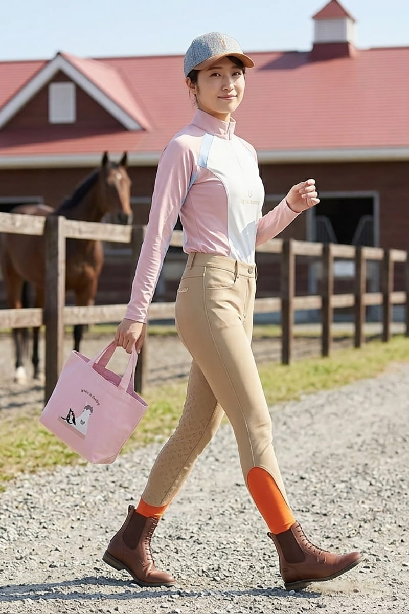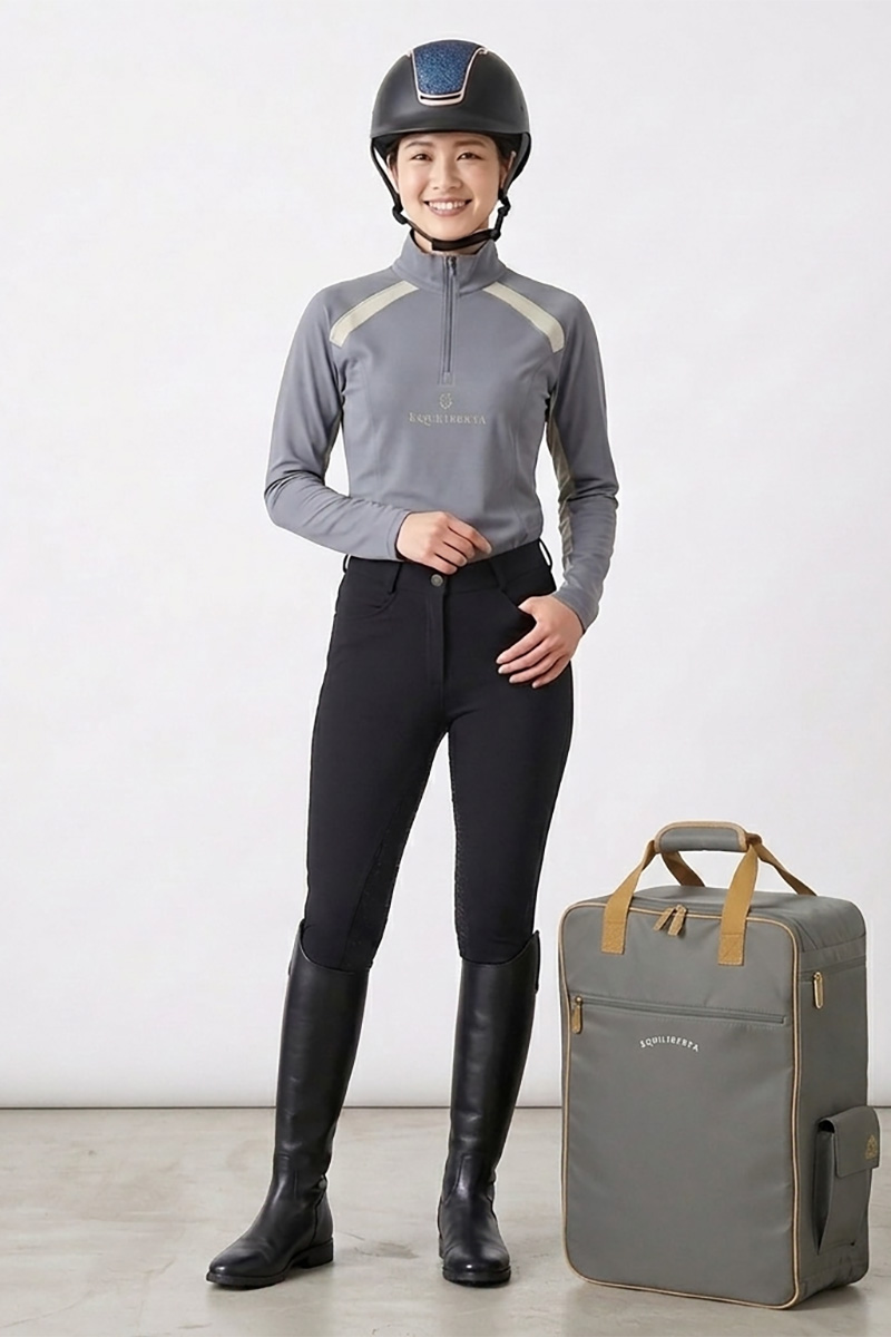 トップスのフロントに施されたクリスタルが日差しにきらめき、春夏の乗馬に華やかさを添えてくれます。